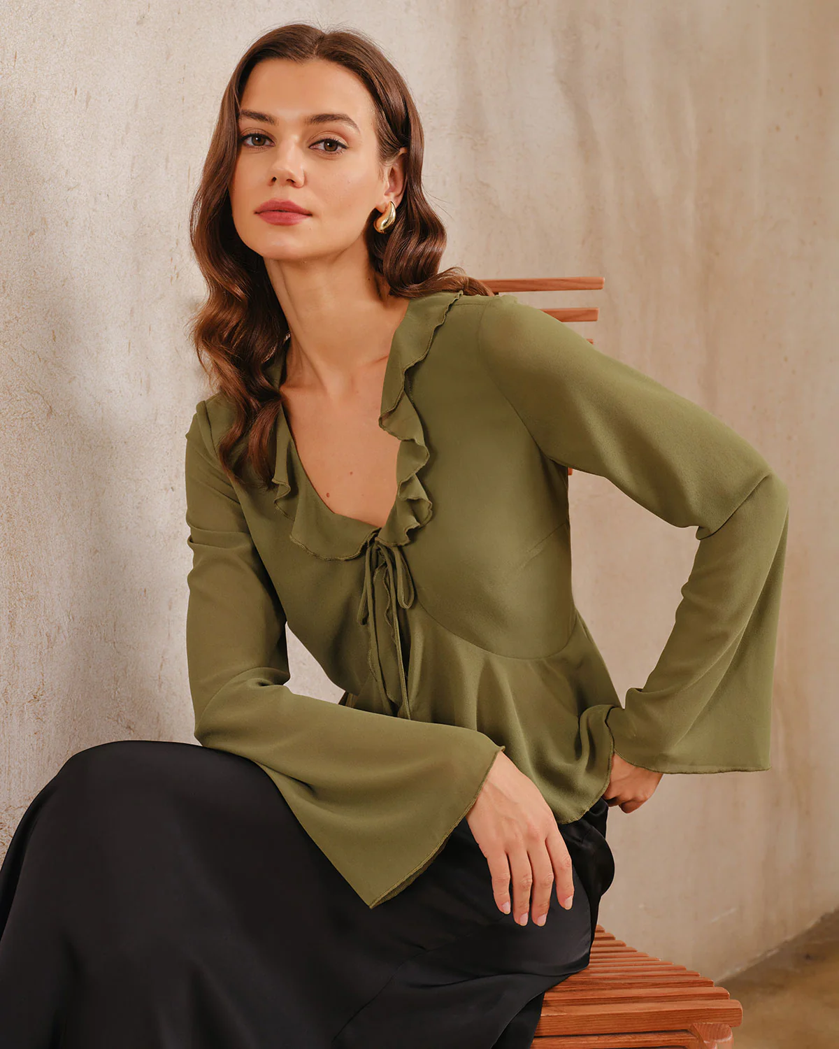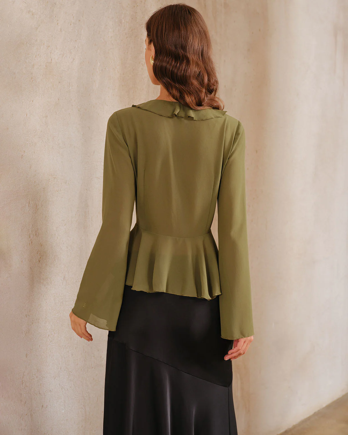 Green Chiffon Ruffle Bell Sleeve Blouse