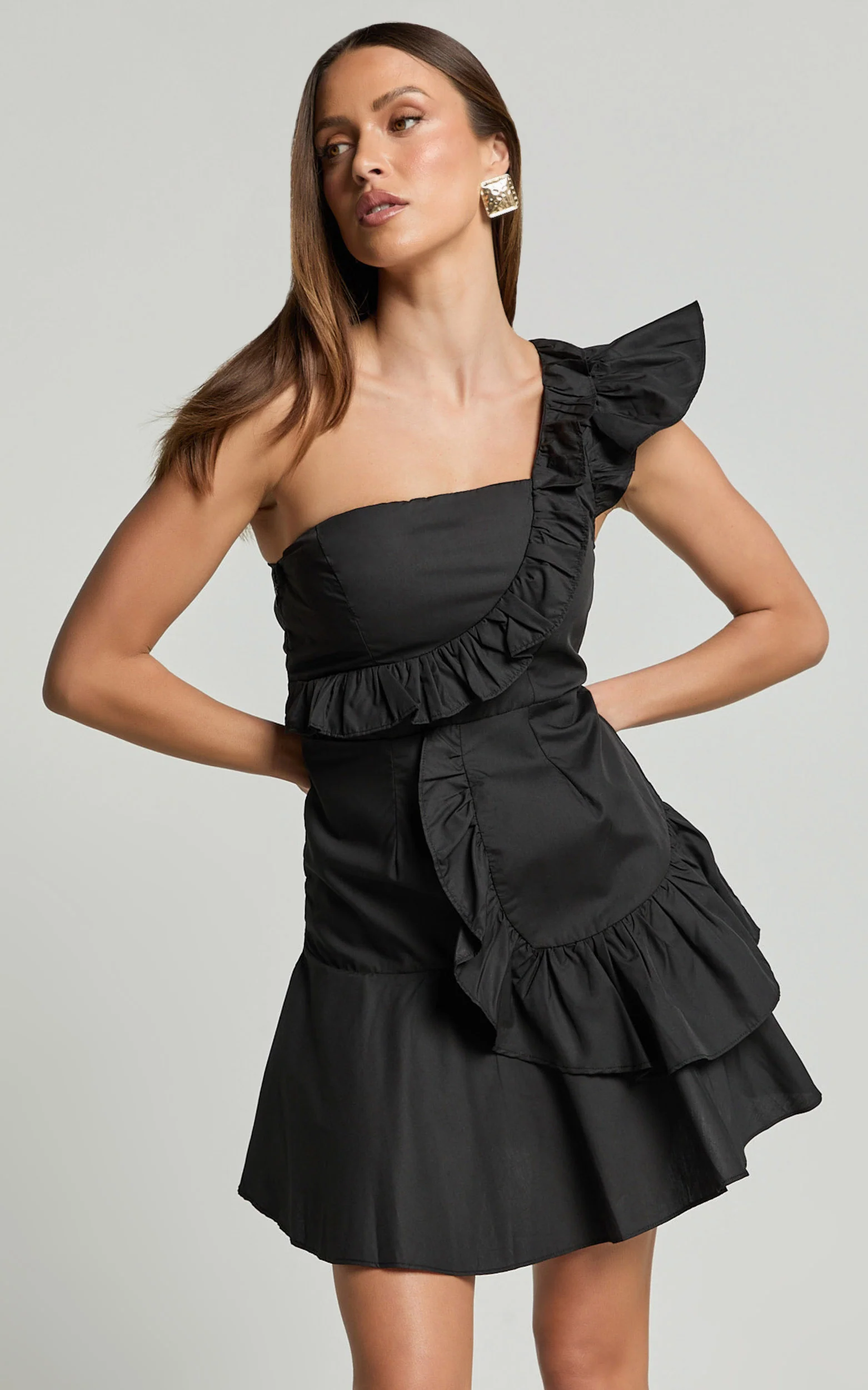 Valerie Mini Dress - One Shoulder Ruffle Detail A Line Dress in Black