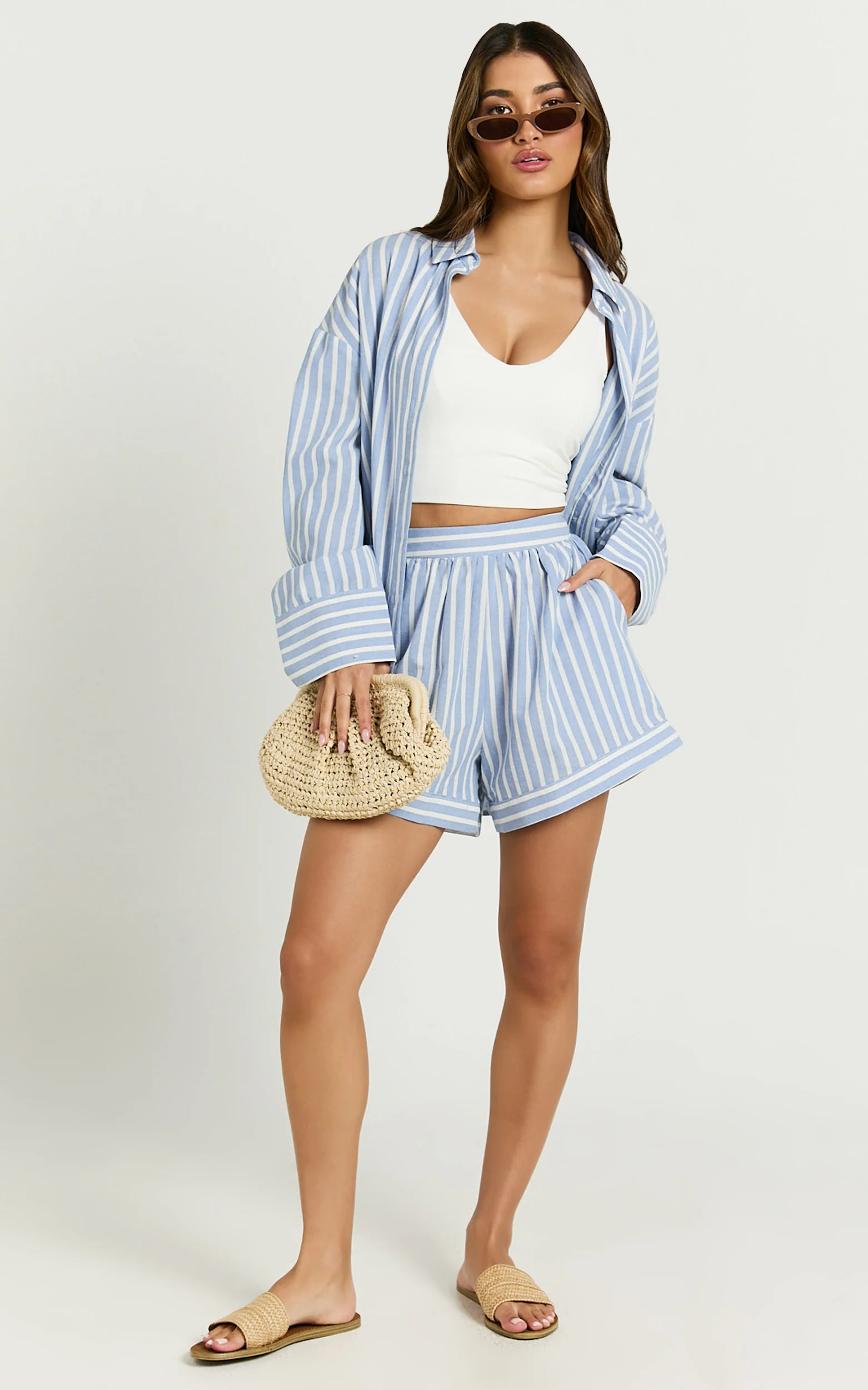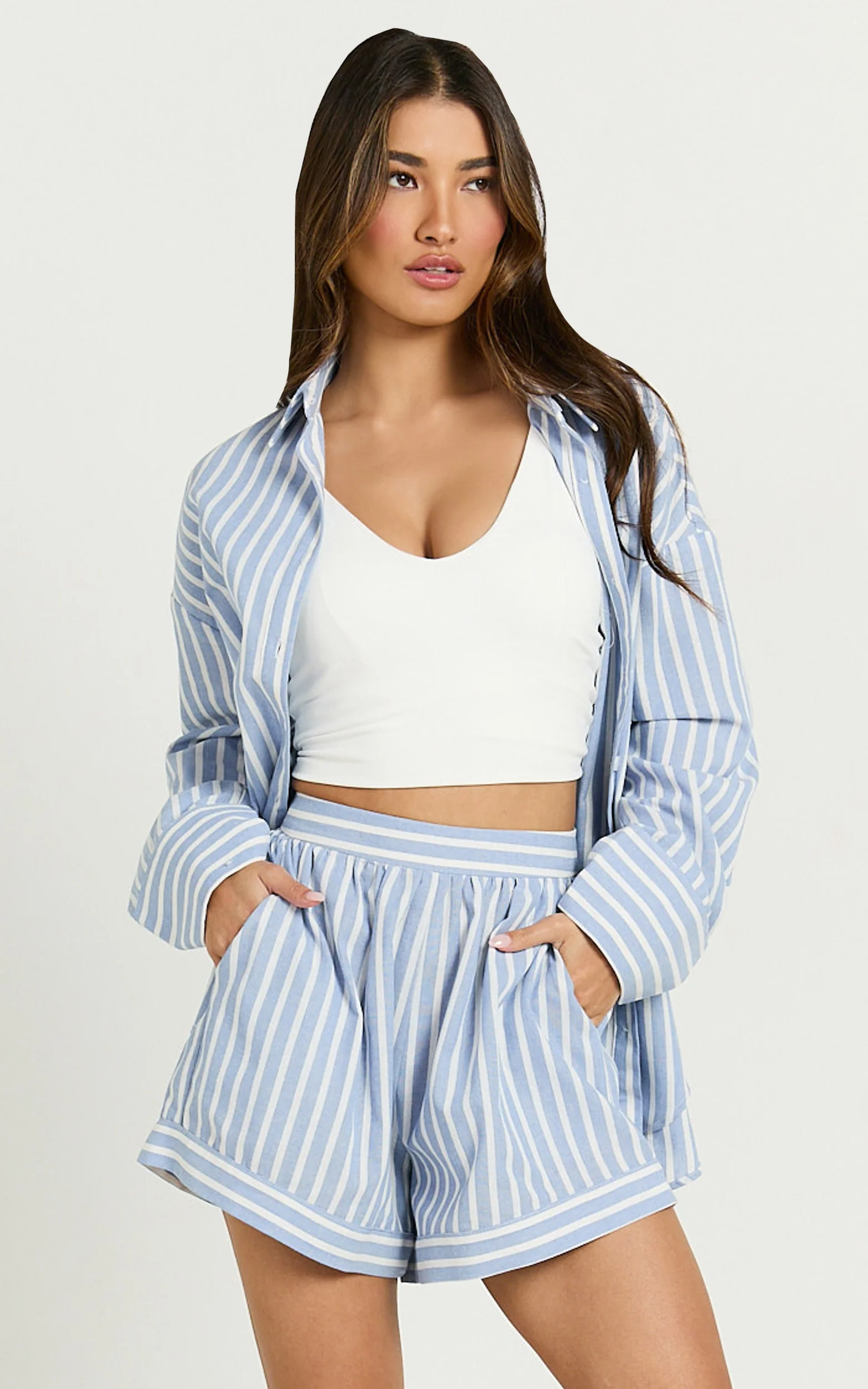Tori Shorts - High Waist A Line Stripe Shorts in Light Blue Stripe