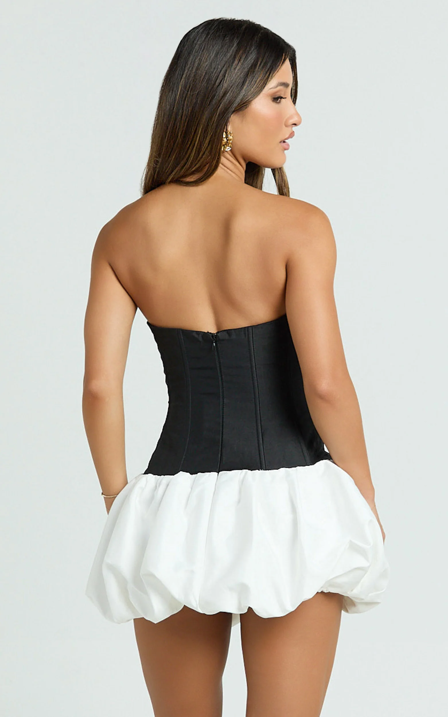 Santana Mini Dress - Strapless Fit And Flare Bubble Hem Dress in Black/White