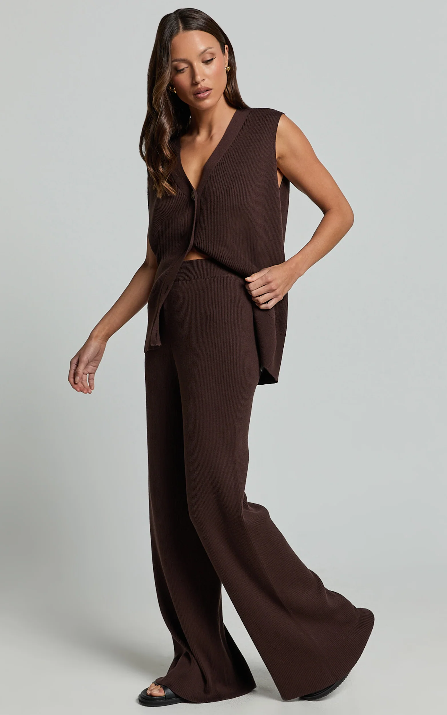 Sasha Pants - Knitted High Waist Wide Leg Pants in Chocolate