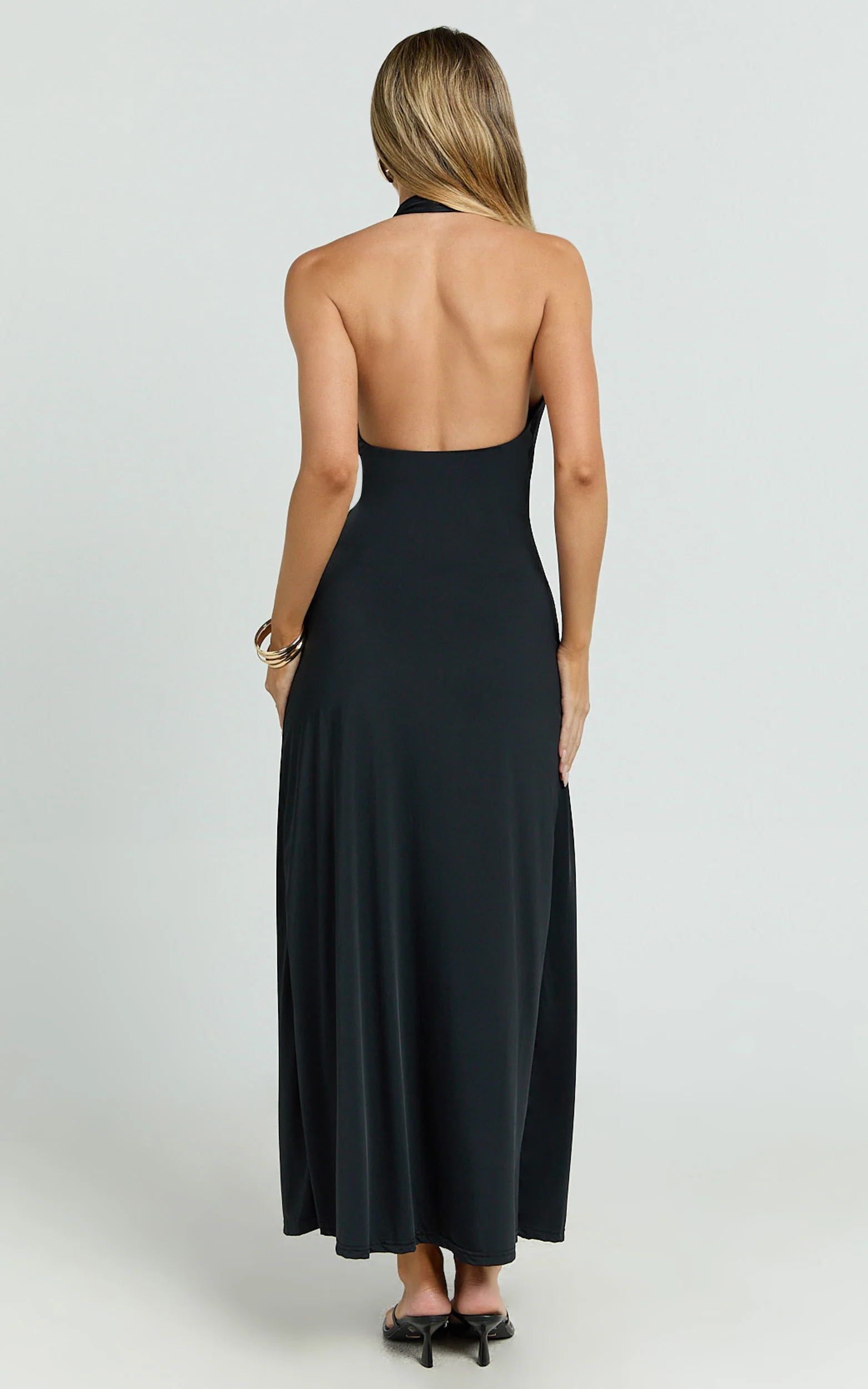 Roseville Maxi - Wrap Front Halter Dress with Hardware Detail in Black