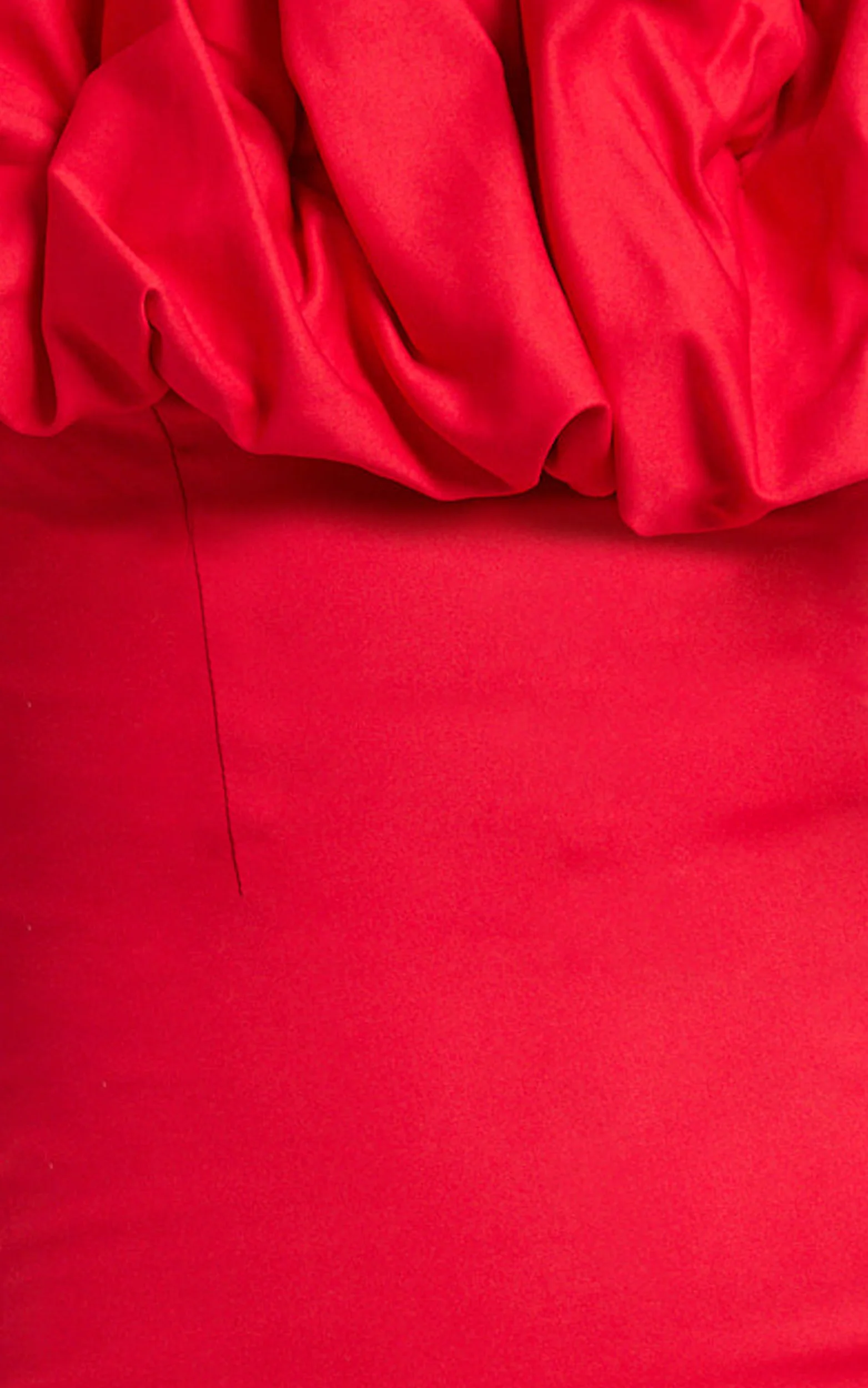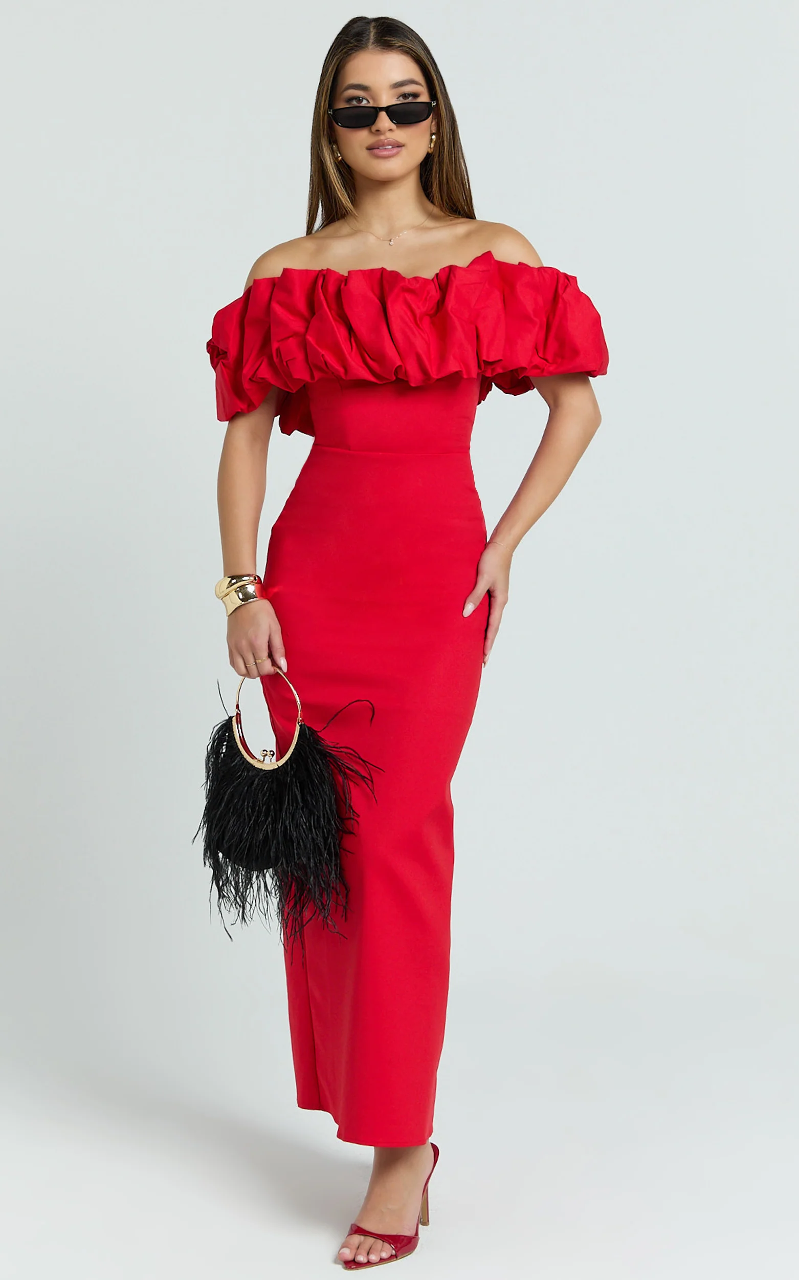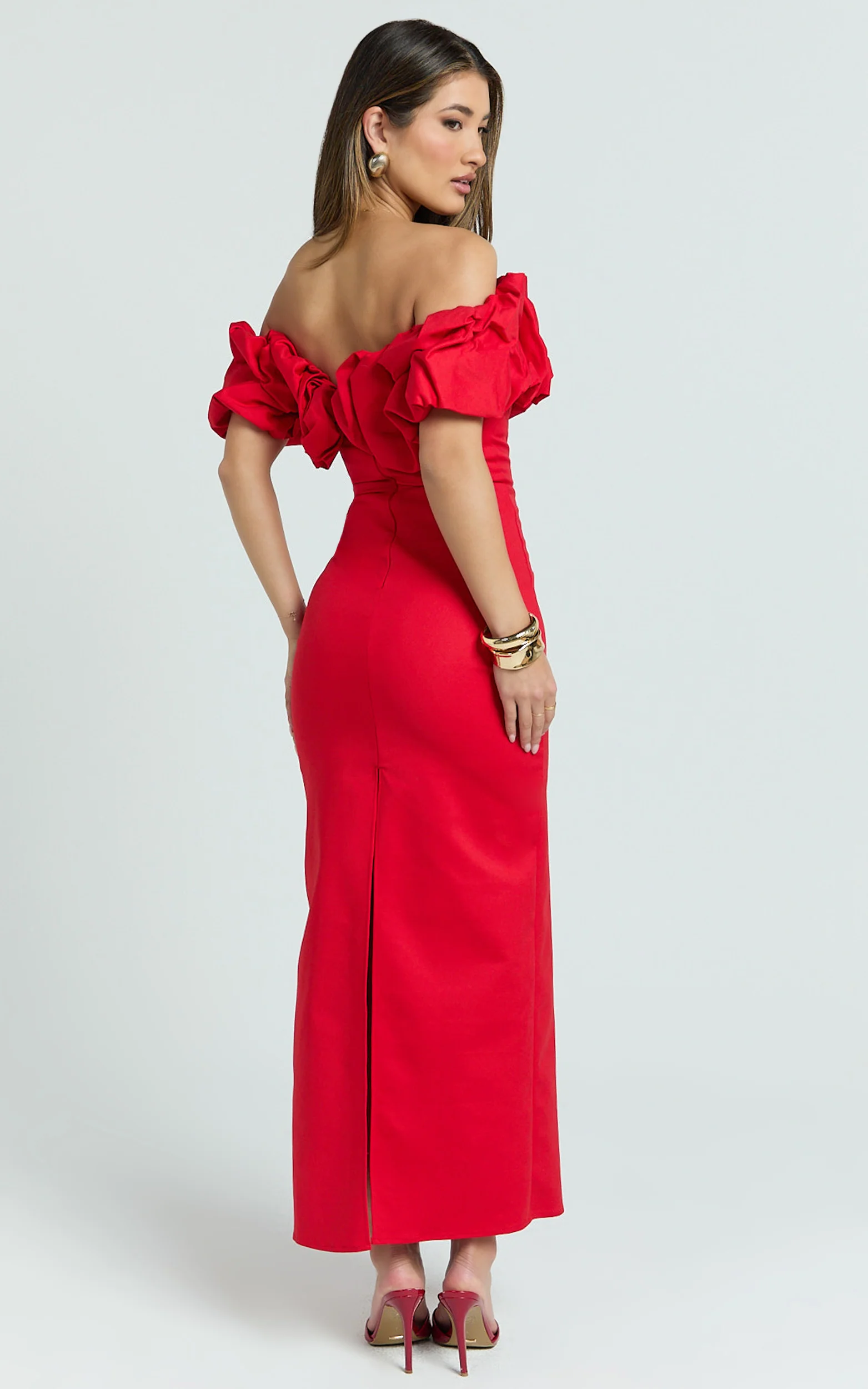 Rhaya Maxi Dress - Ruffle Off Shoulder Fitted Dress in Red
