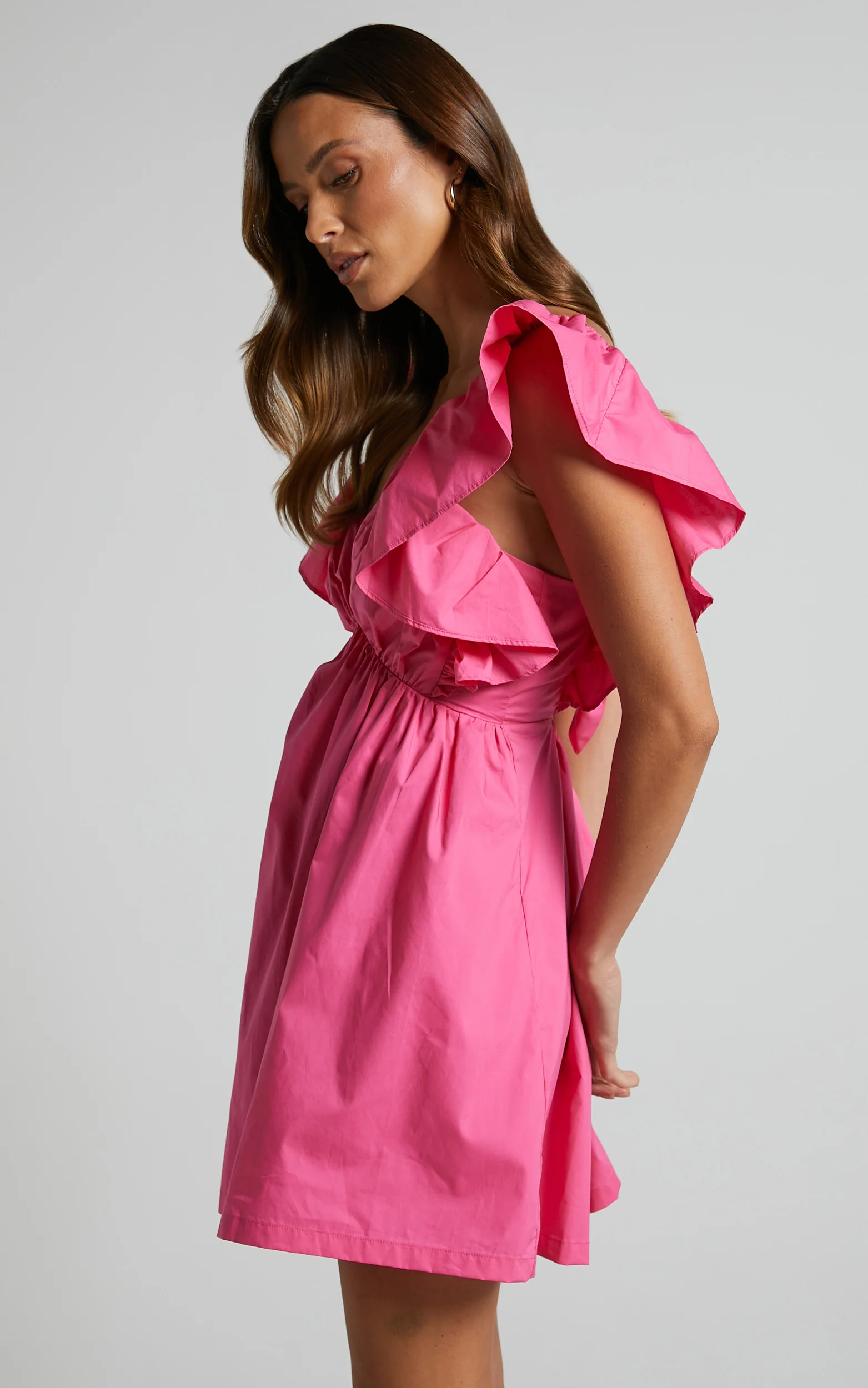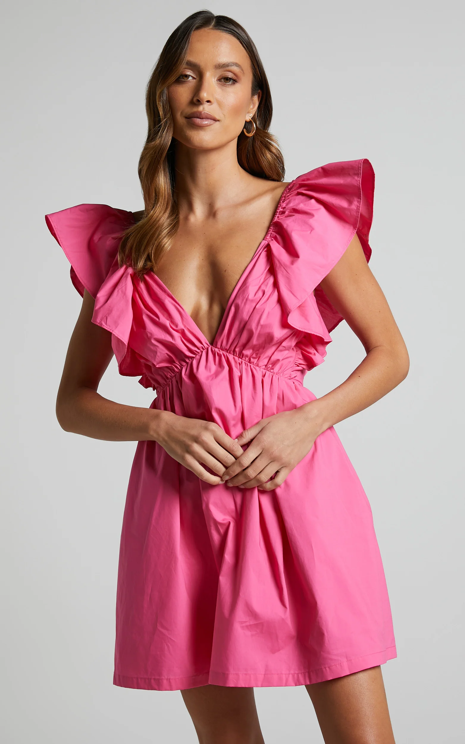 Raiza Mini Dress - Ruffle Sleeve Tie Back Plunge Dress in Fuchsia