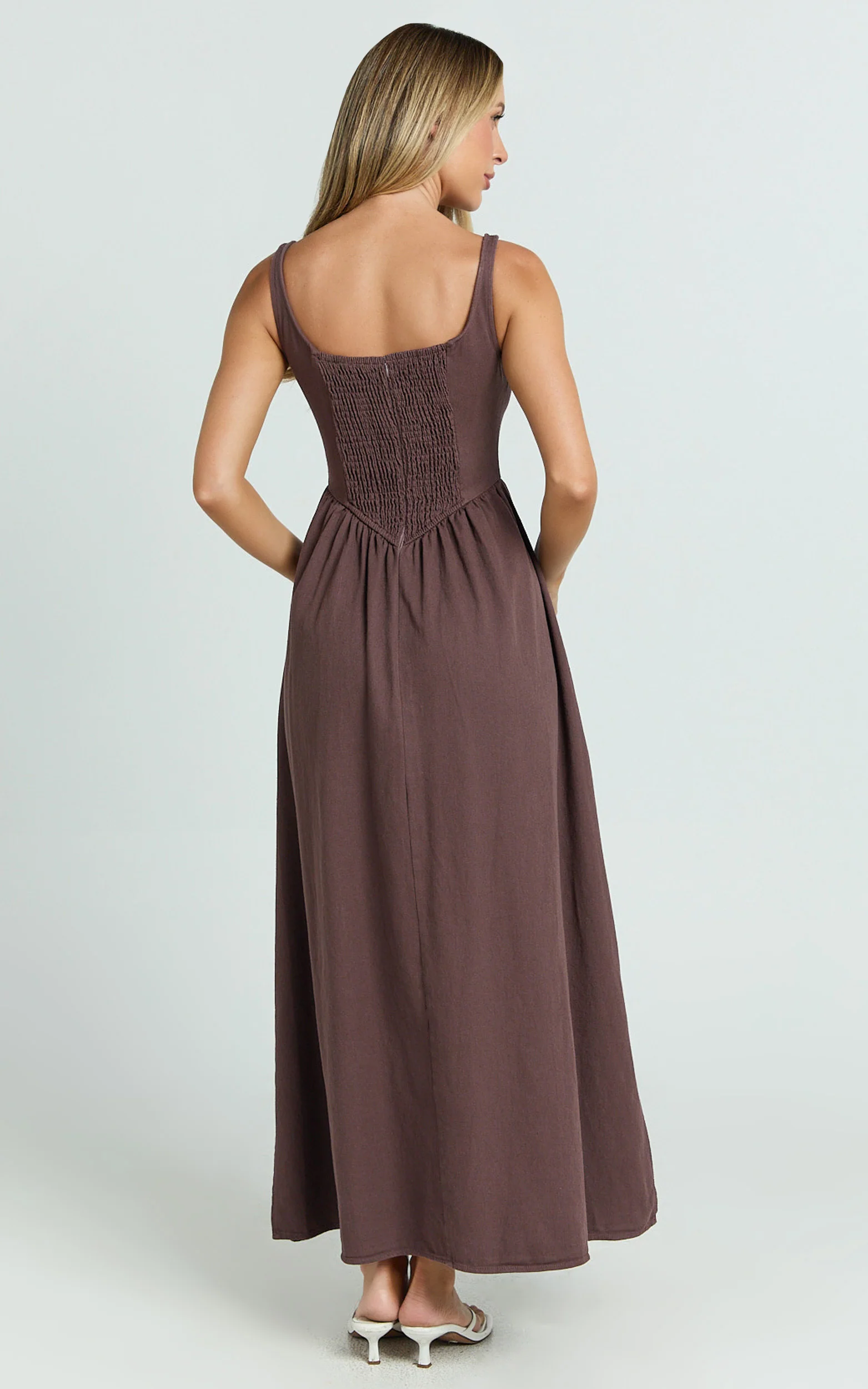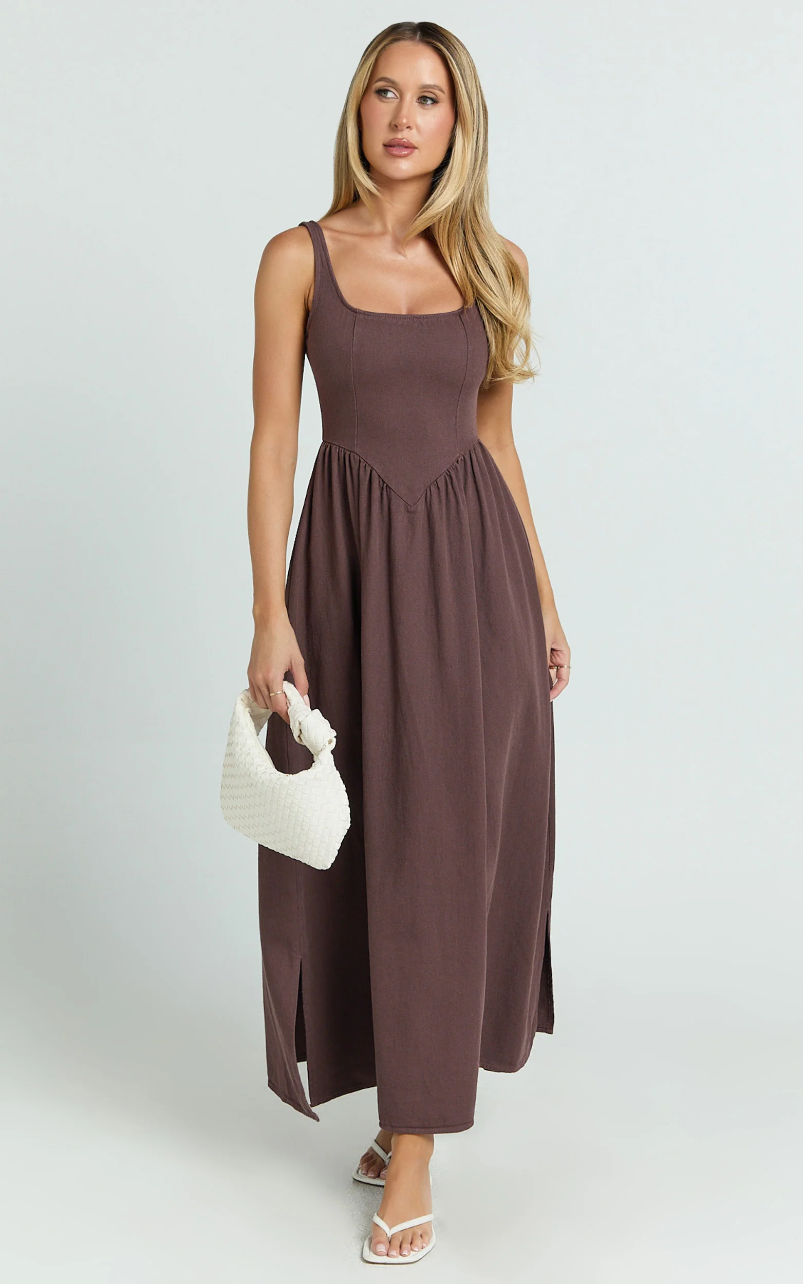 Rhaziya Midi Dress - Sleeveless Straight Neck Fit and Flare Dress in Chocolate