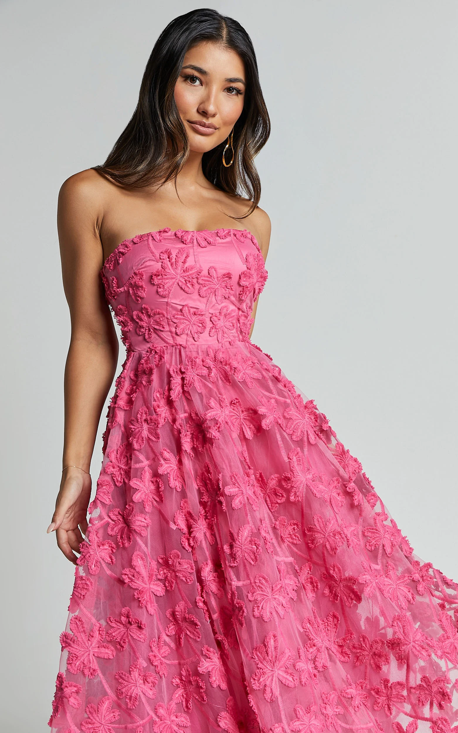 Rheiva Midi Dress - Strapless 3D Embroidery Midi Dress in Pink