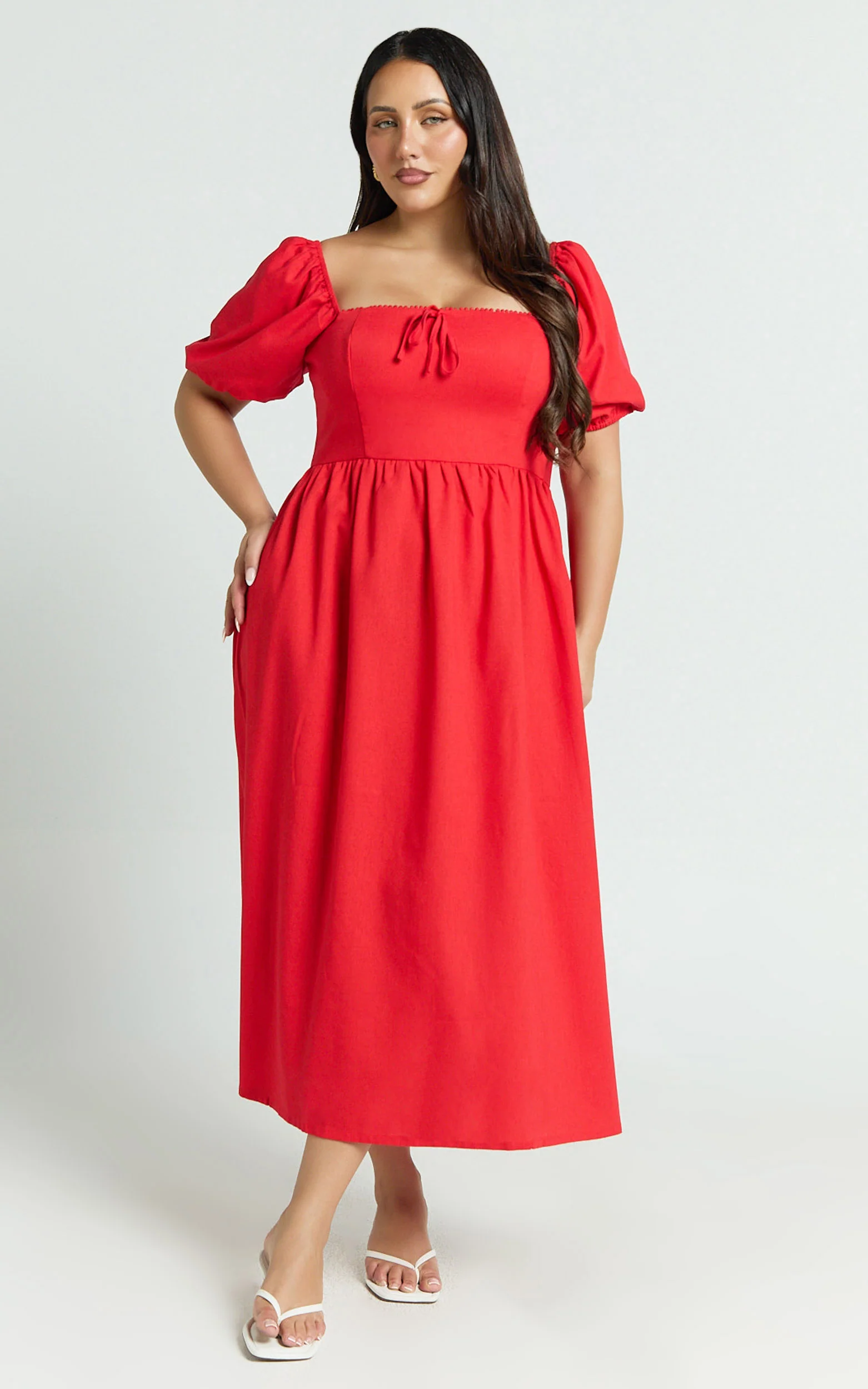 Quinn Midi Linen Blend Dress - Puff Sleeve Square Neck Dress in Red