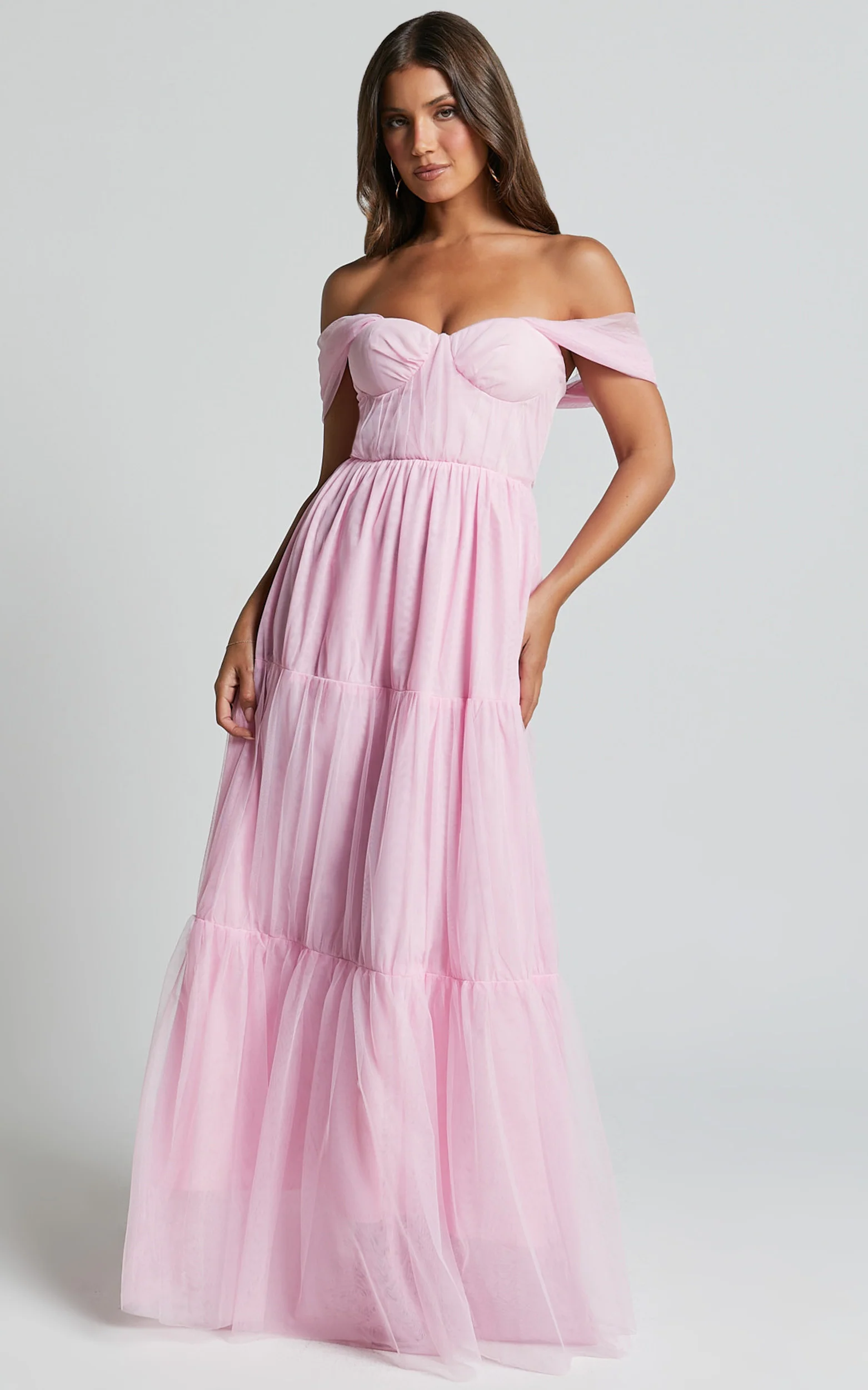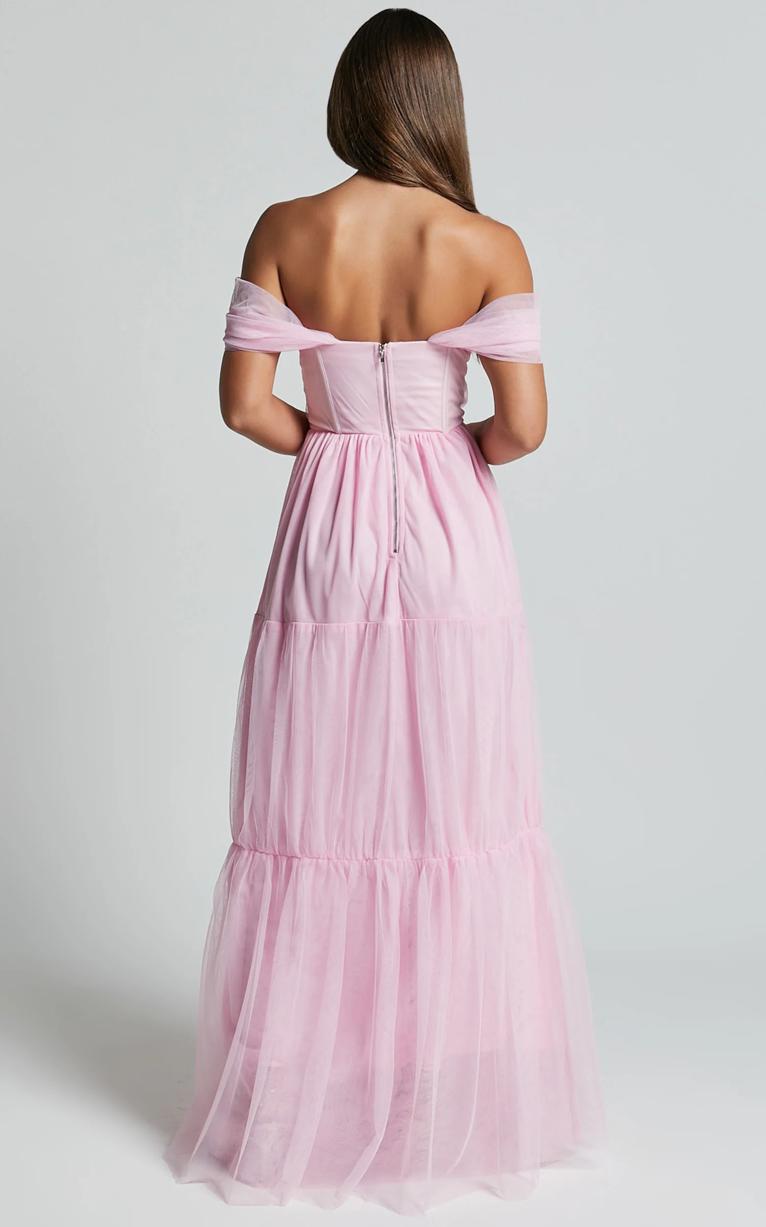 Ontario Maxi Dress - Off Shoulder Corset Bodice Tulle Dress in Ballet Pink