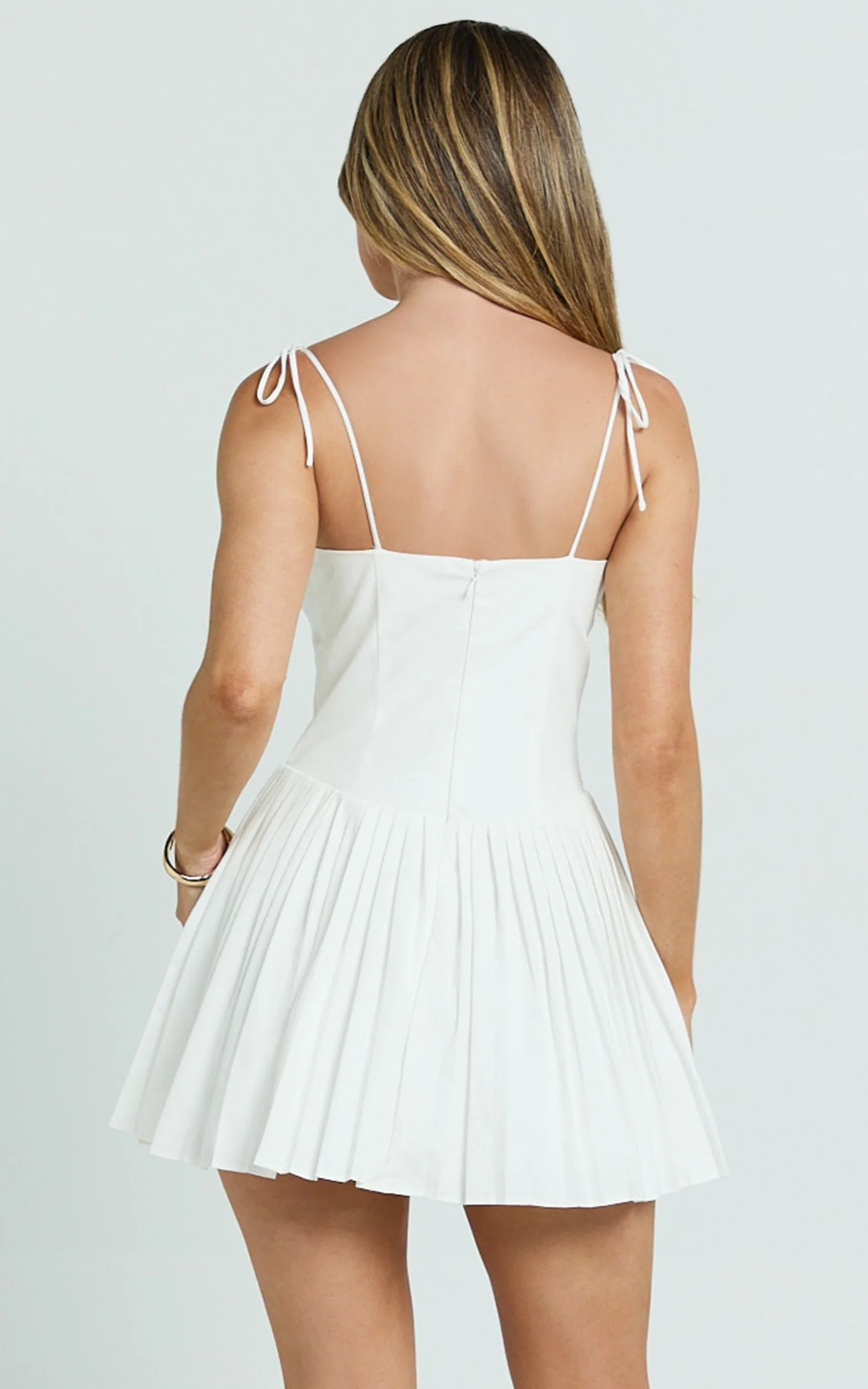 Nicolette Mini Dress - Square Neck Strappy Tie Shoulder Drop Waist Pleated Skirt Dress in Off White