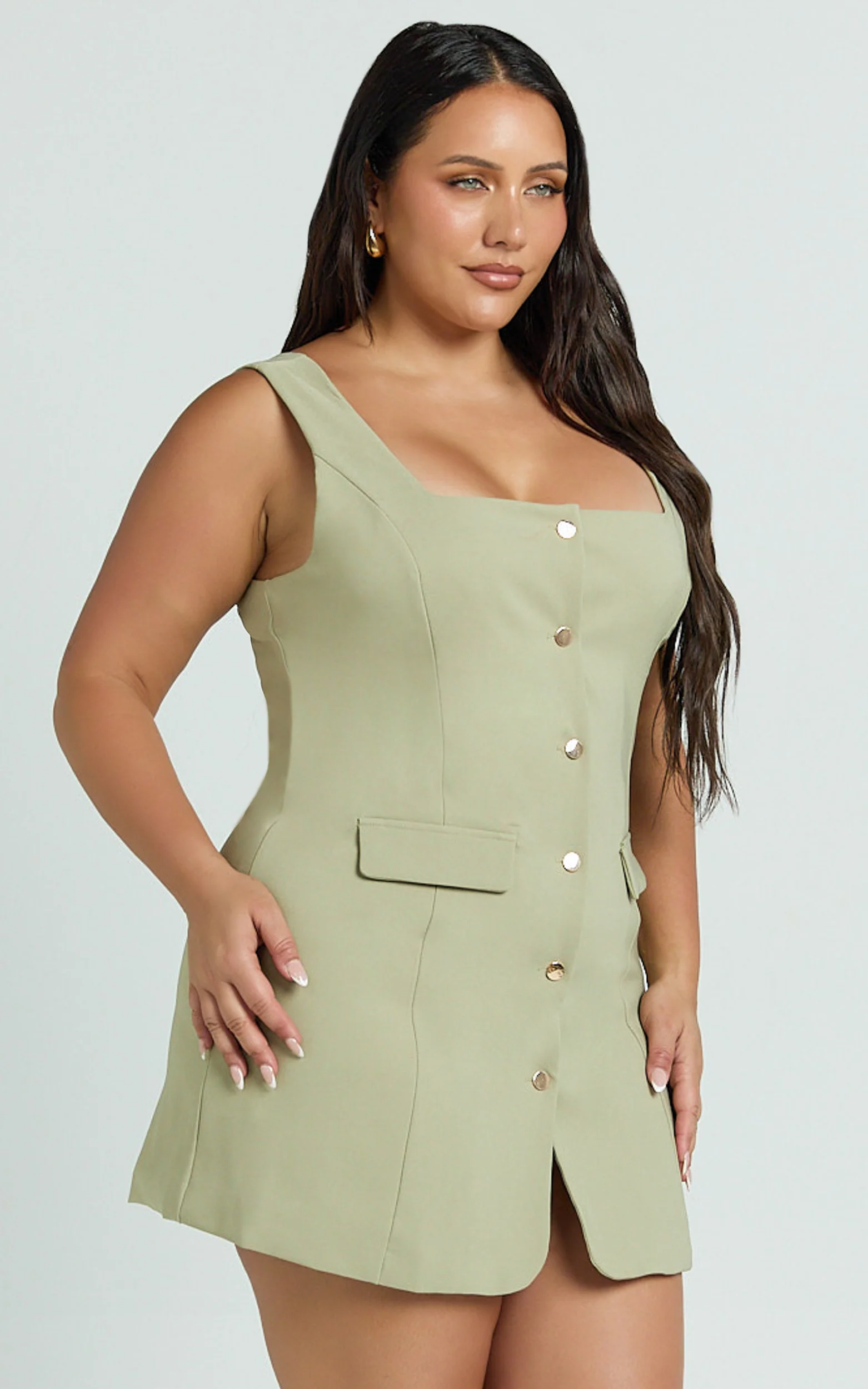 Kenna Mini Dress - Square Neck Button Down Mini Dress in Sage