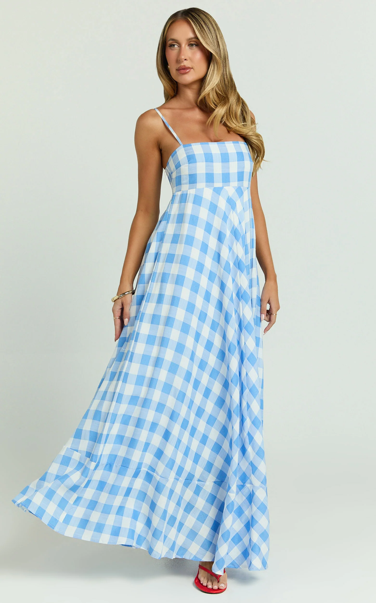 Katrien Maxi Dress - Strappy Empire Waist Flare Dress in Blue Check
