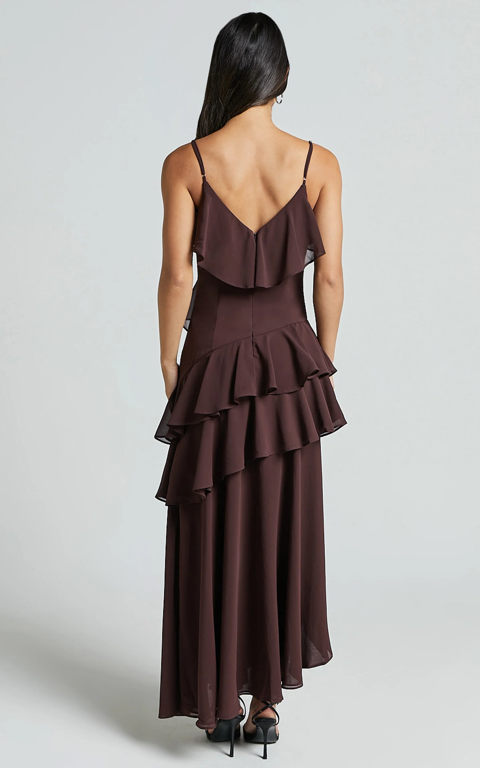 Emily Midi Dress - Strappy Asymmetric Ruffle Dress in Chocolate