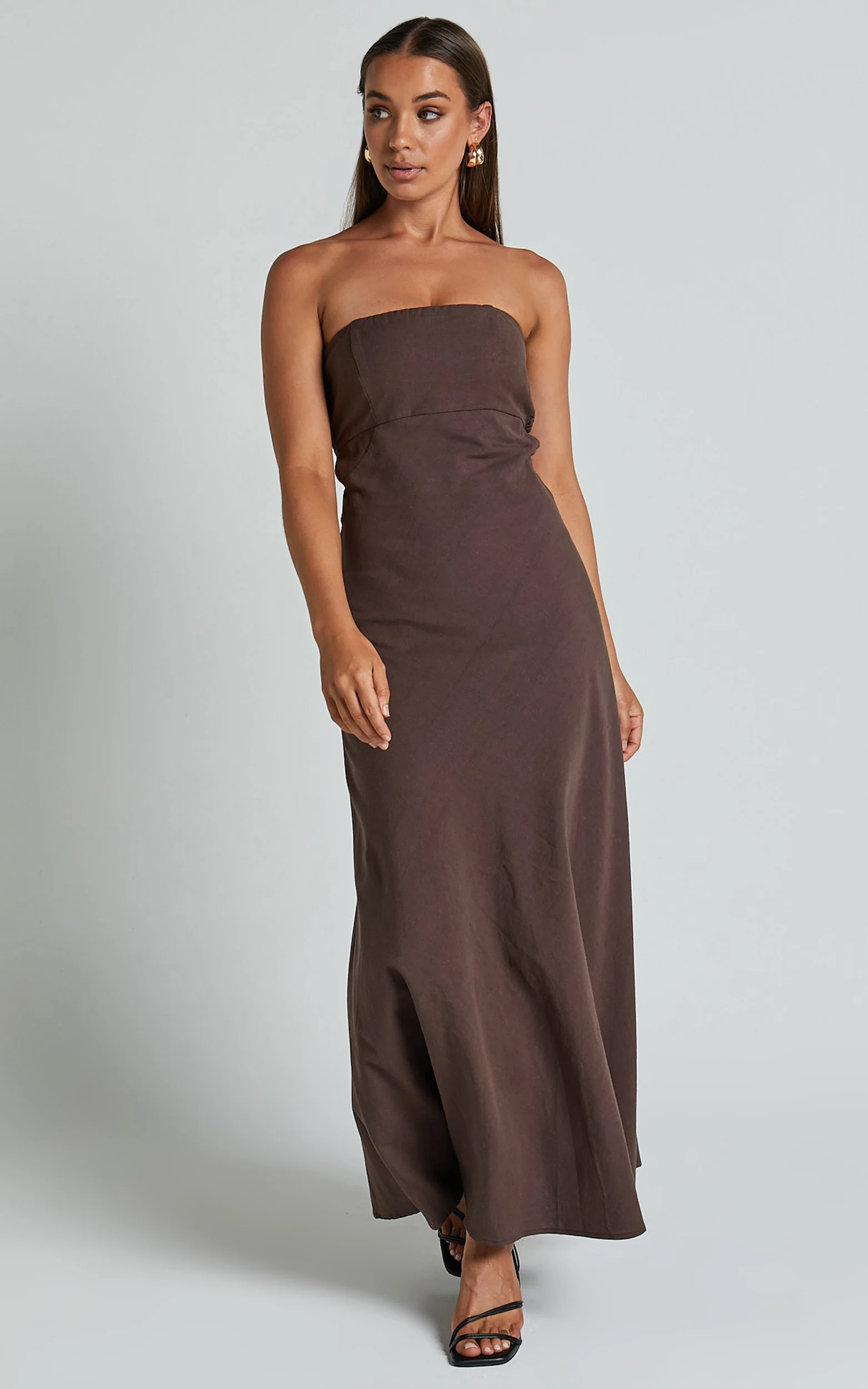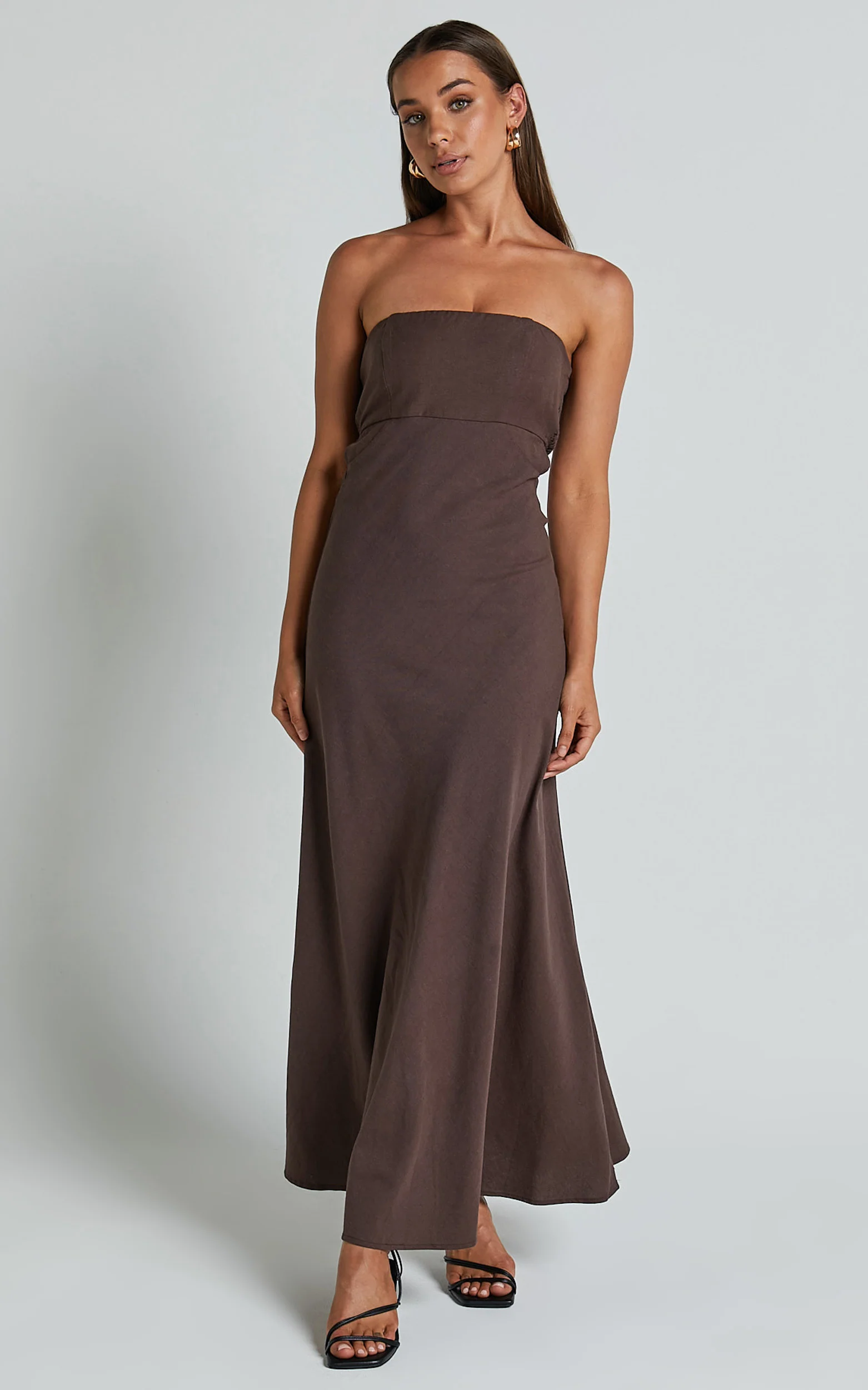 Elerie Maxi Linen Dress - Strapless Linen Dress in Chocolate