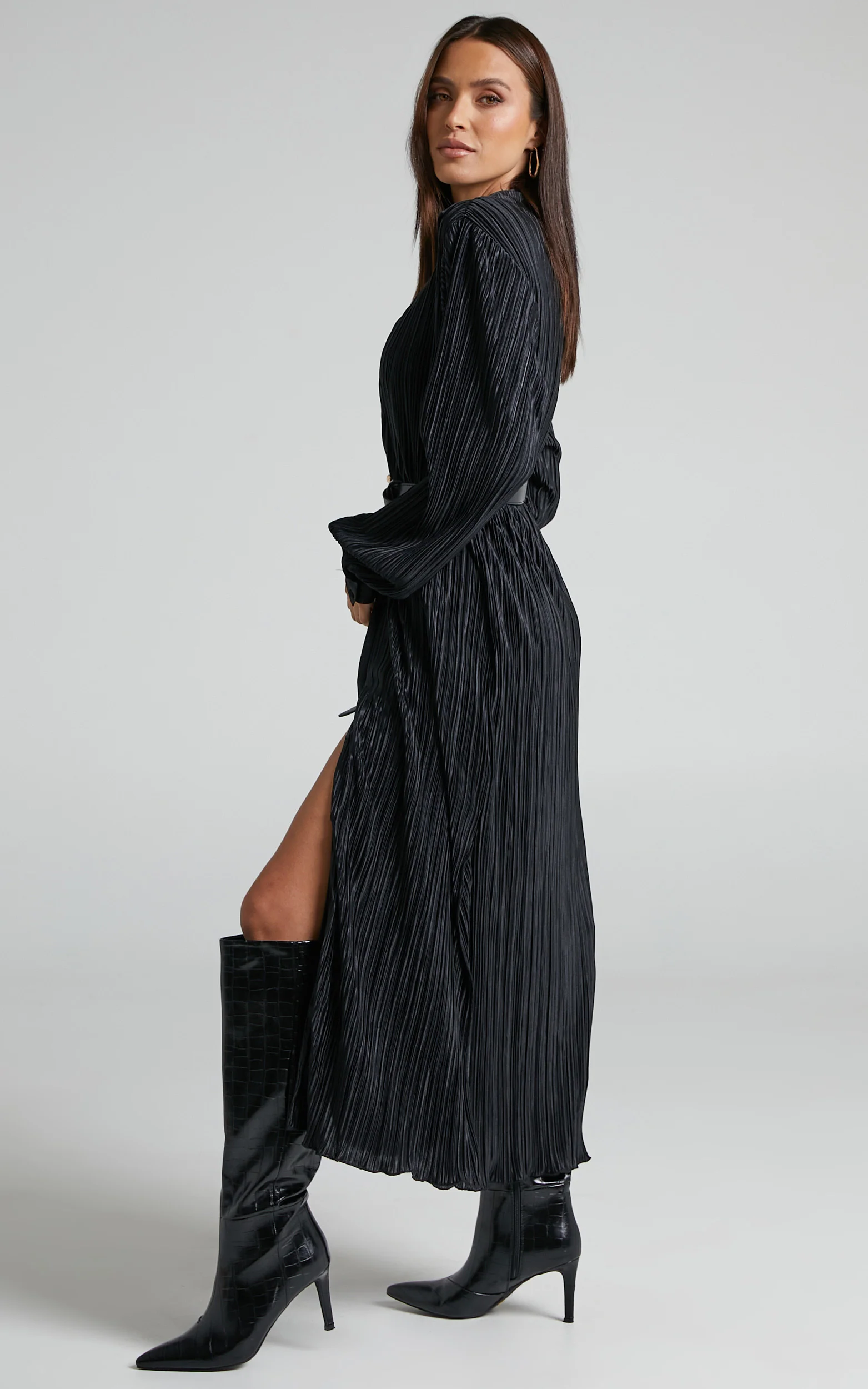 Donelli Midi Dress - Plisse Oversized Collared Shirt Dress in Black