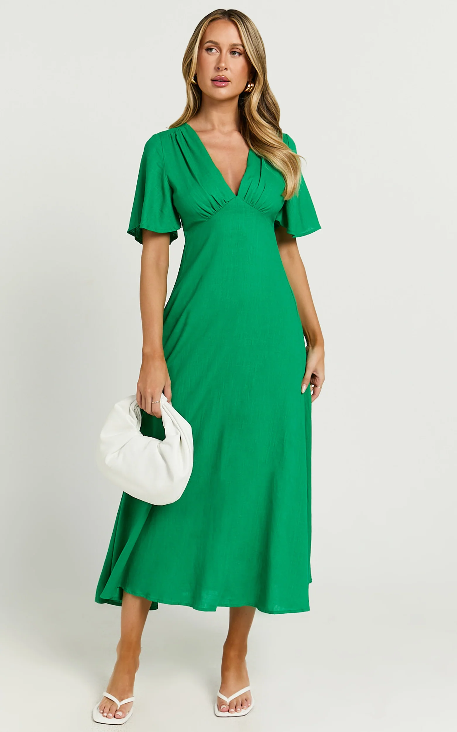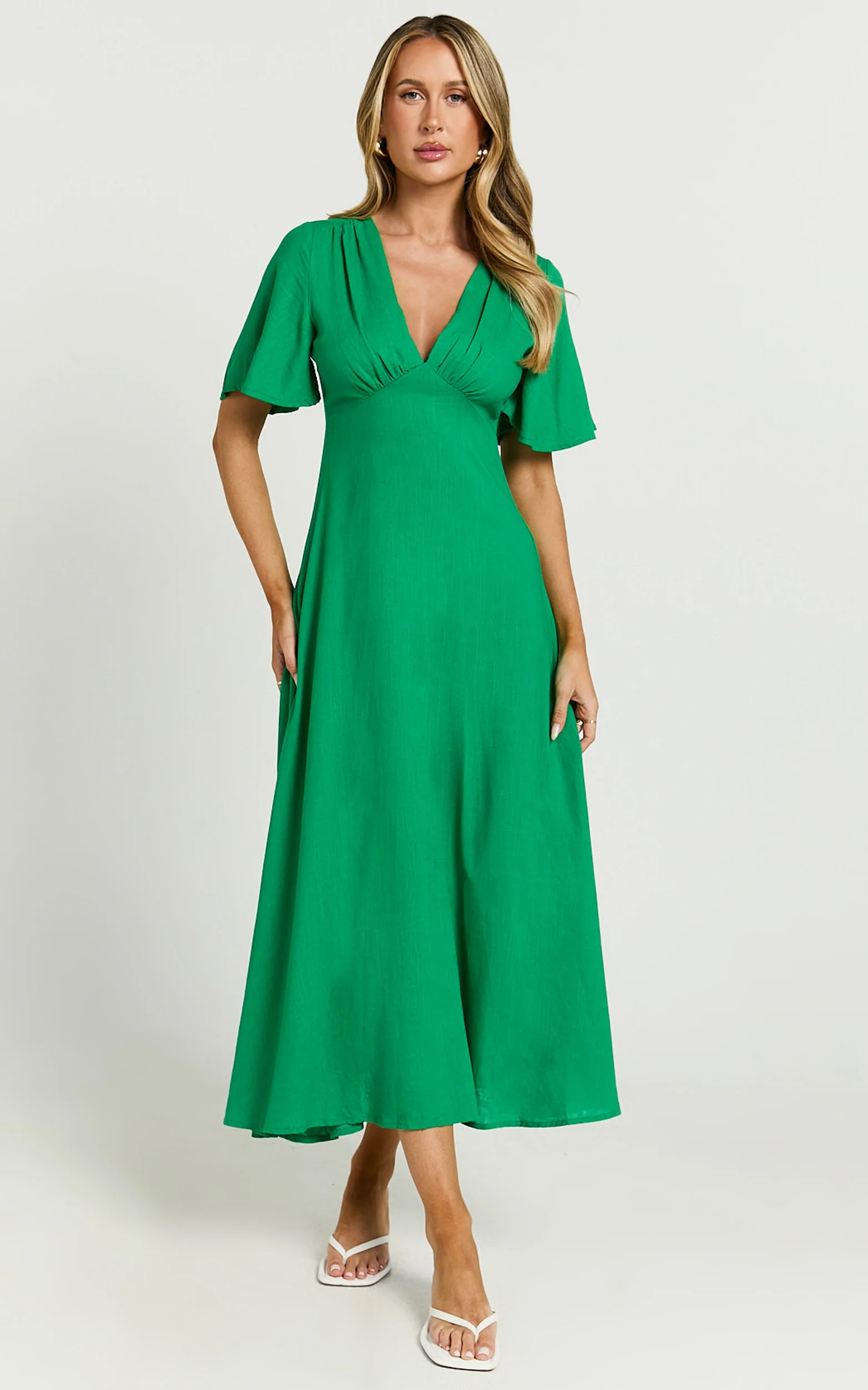 Dakota Midi Dress - Linen Flutter Sleeve A Line Dress in Green
