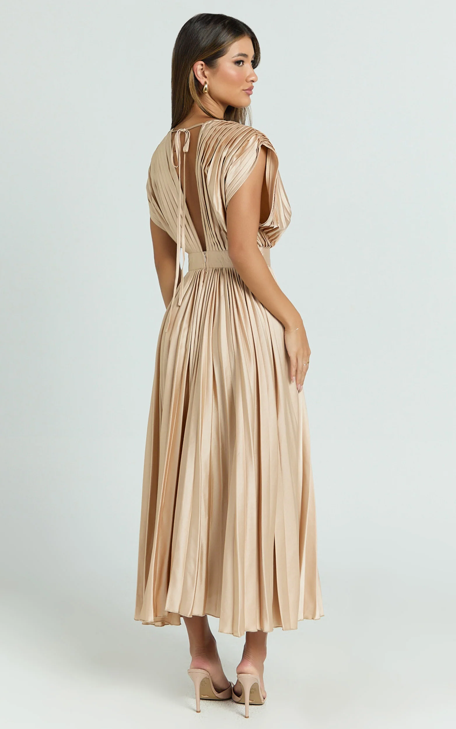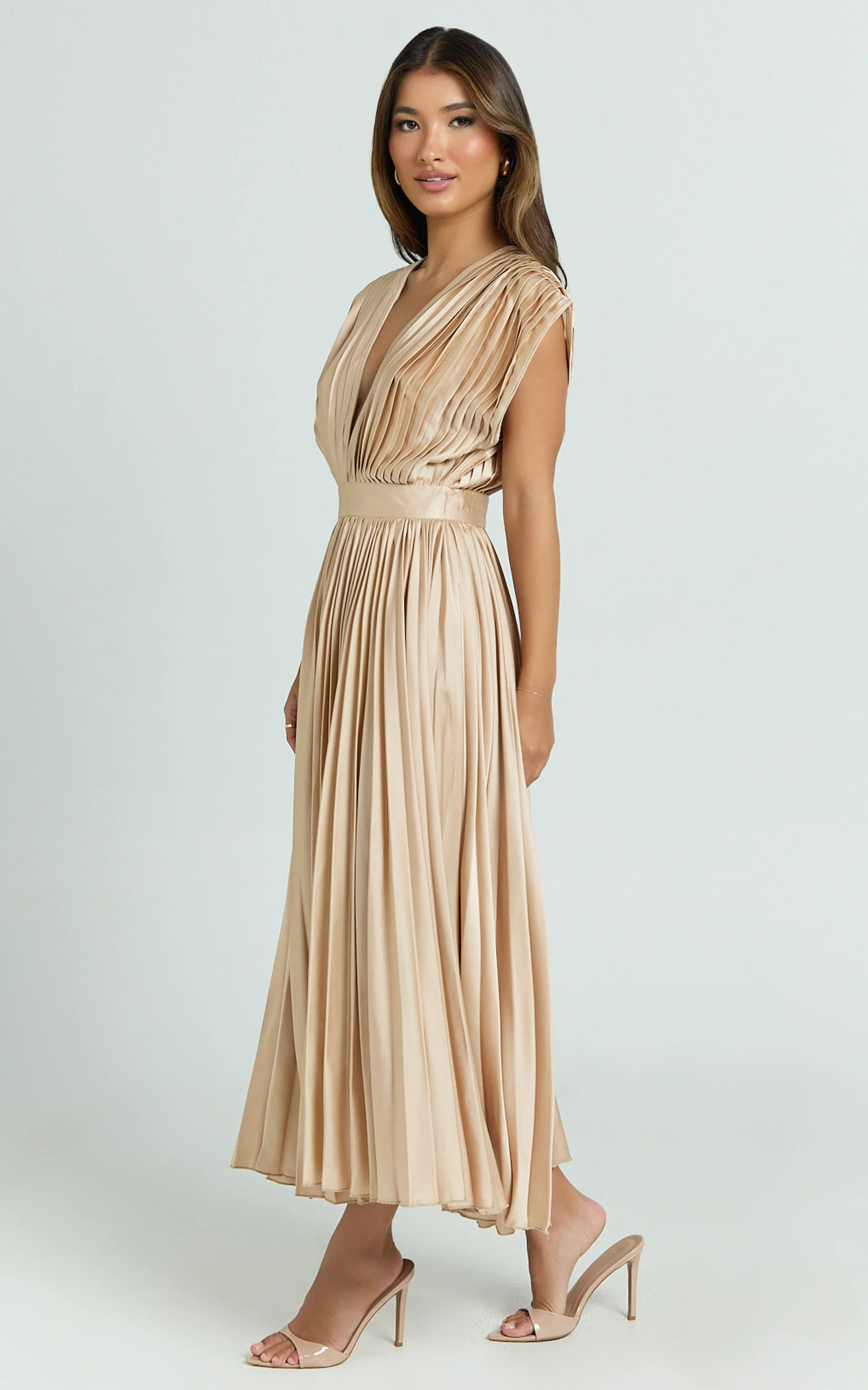 Della Midi Dress - Plunge Neck Short Sleeve Pleated Dress in Champagne