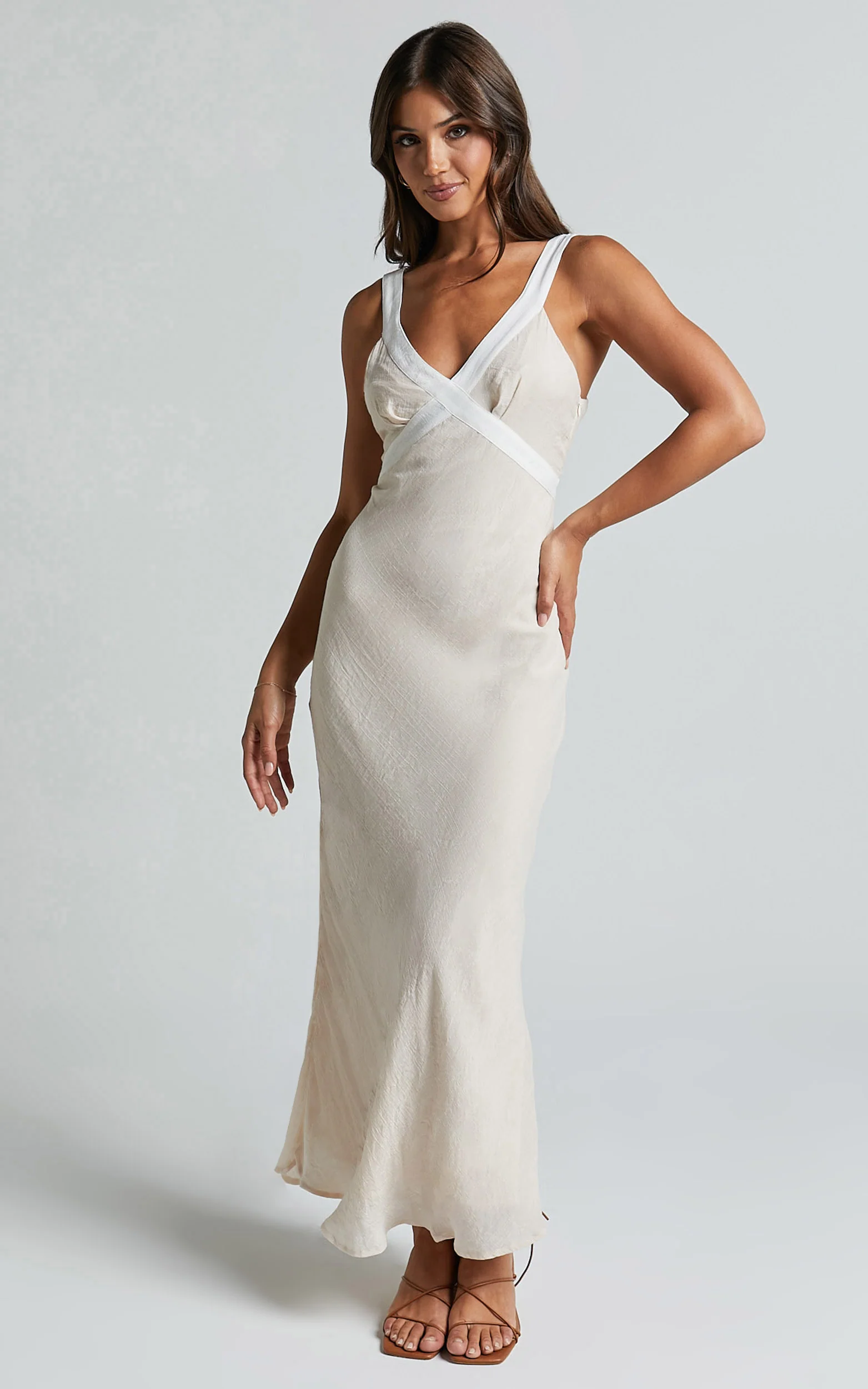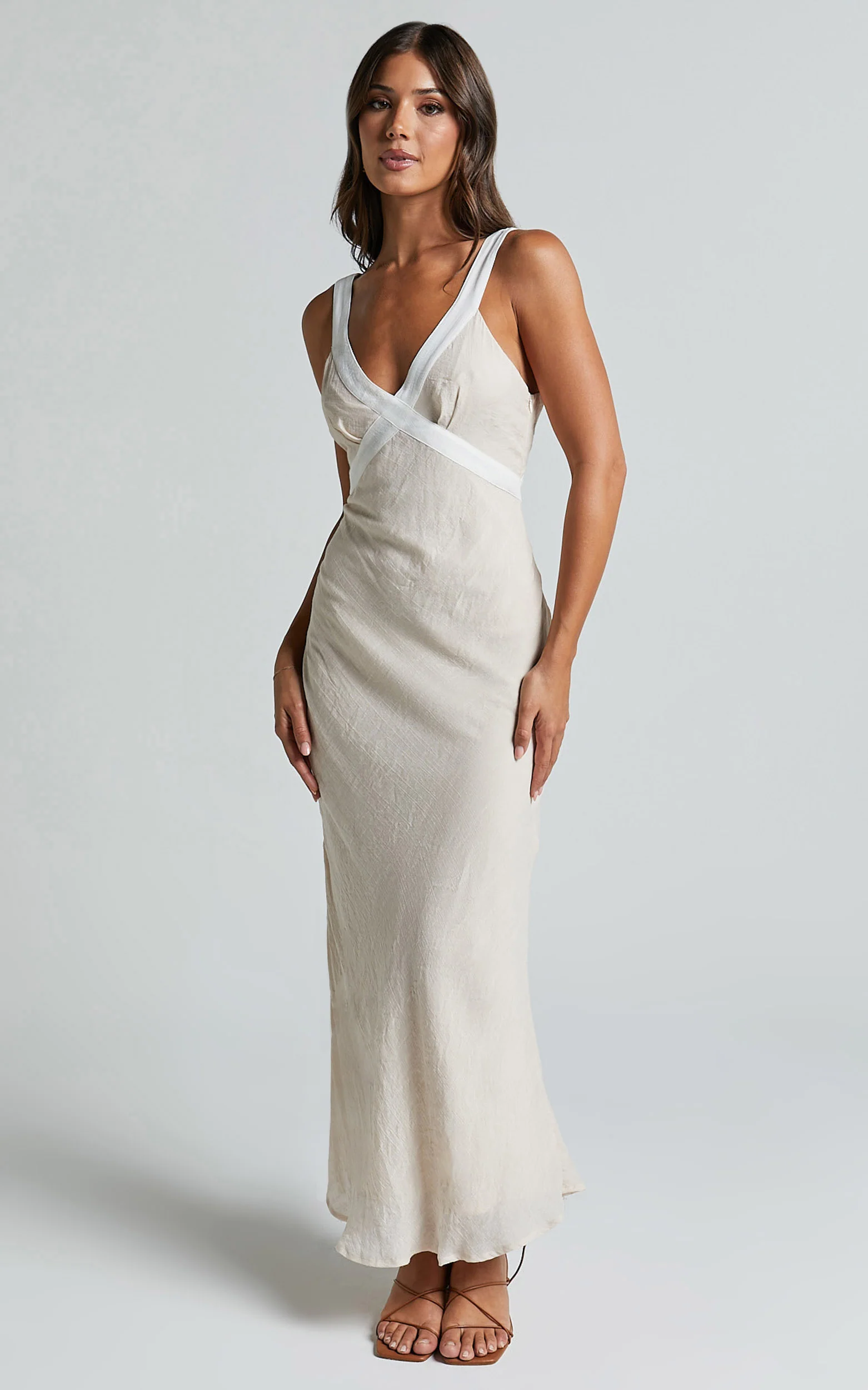 Chakyra Midi Linen Blend Dress - Contrast Strap Bias Cut Column Dress in Beige with White Contrast