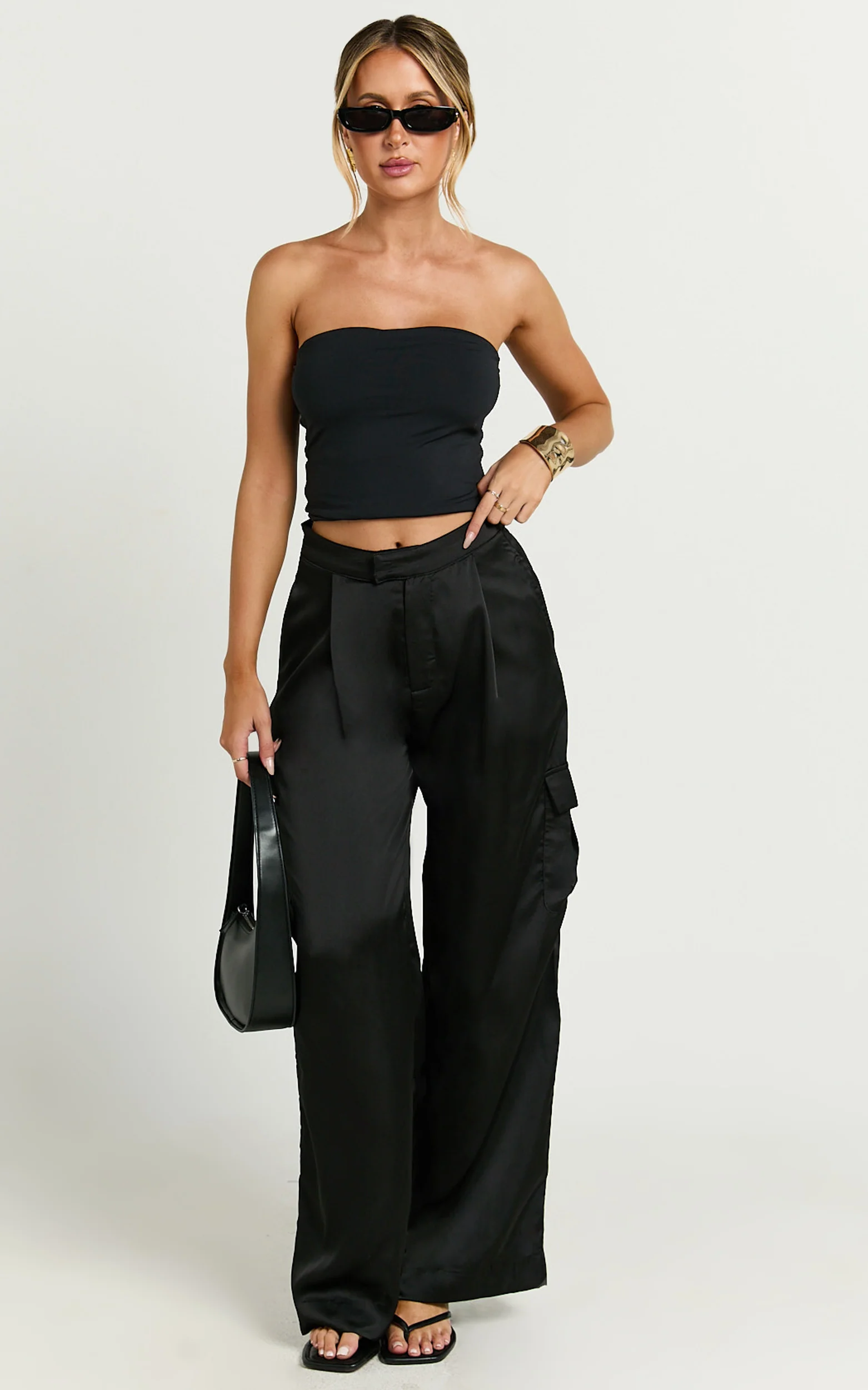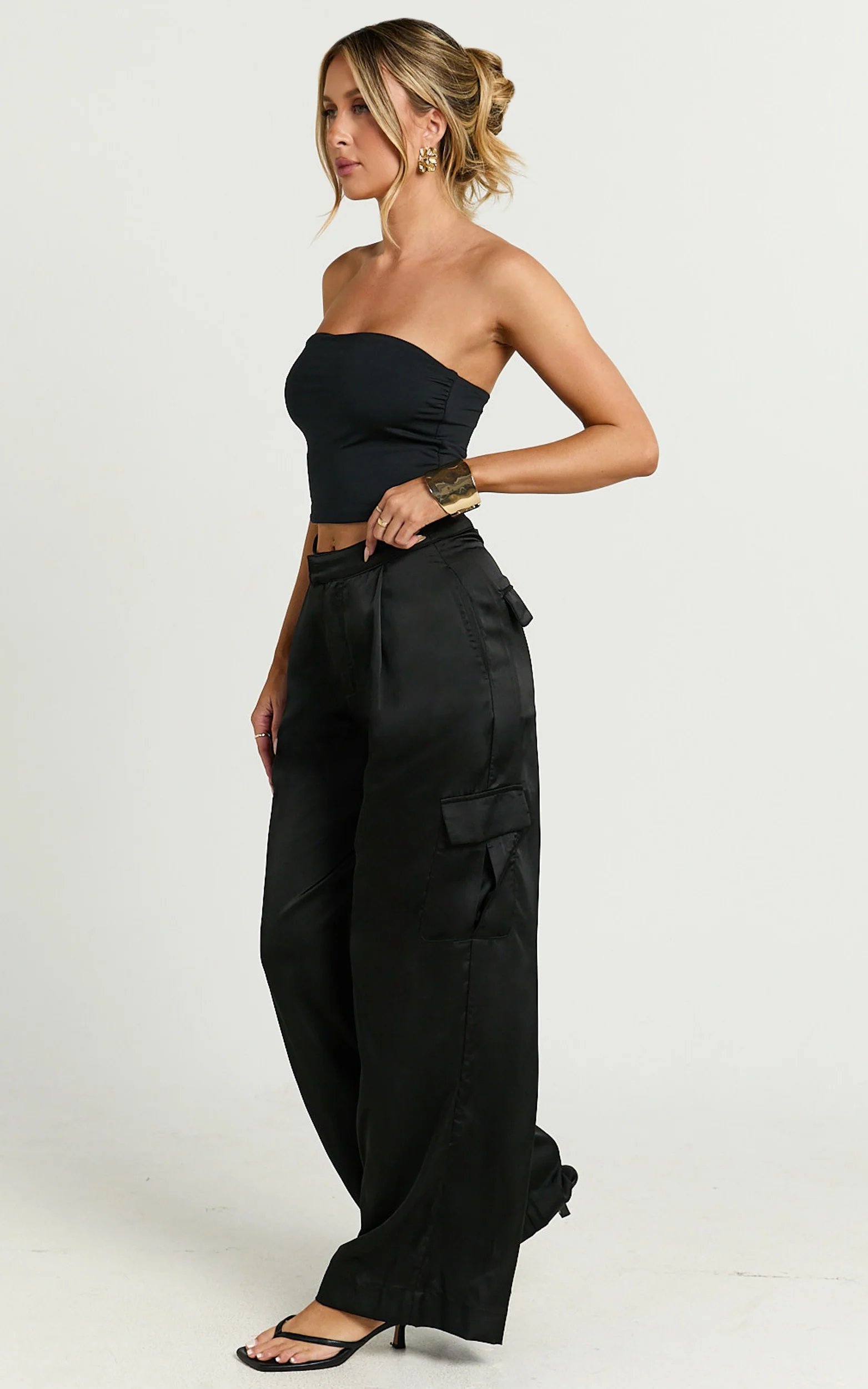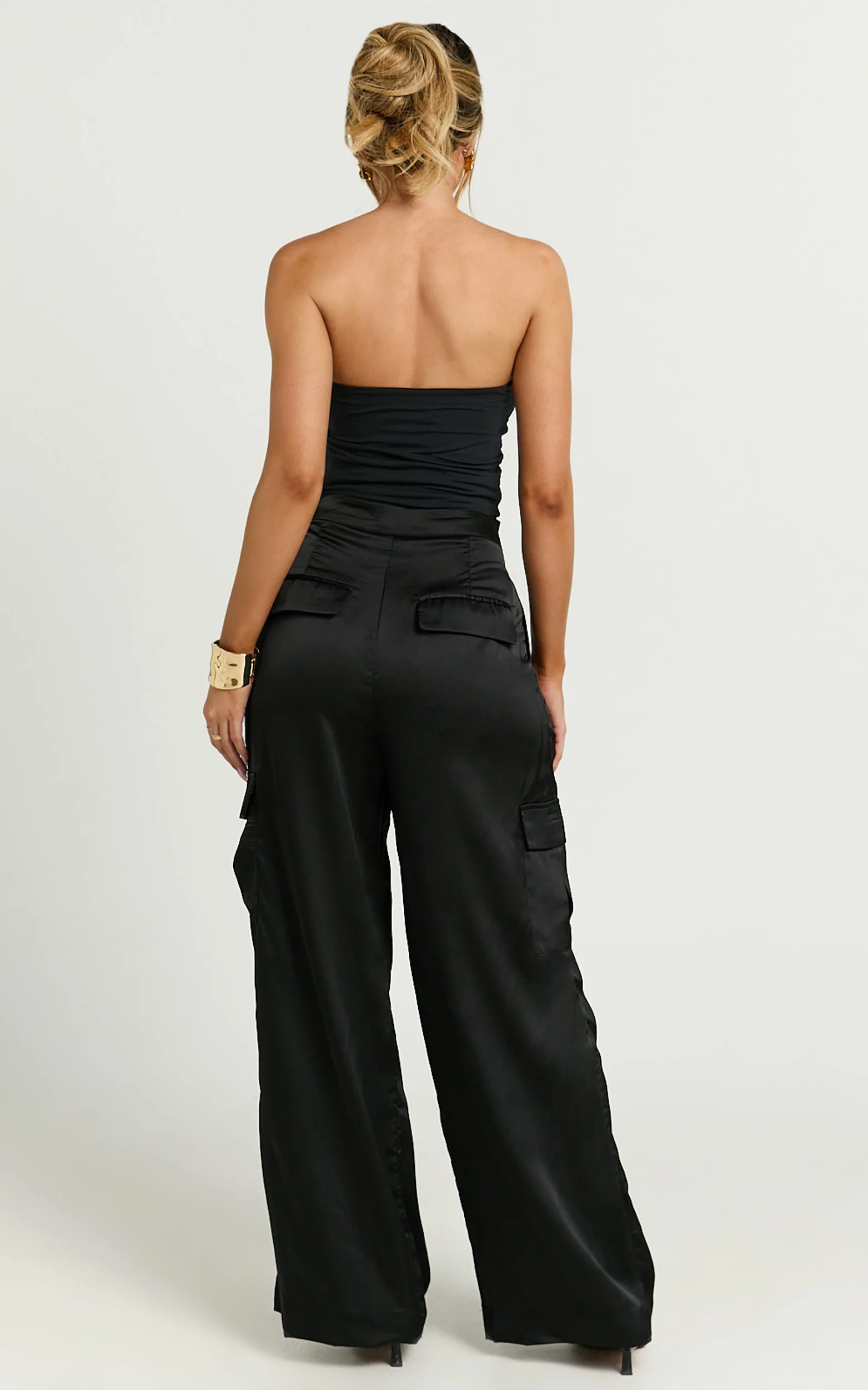Amie Pants - High Waist Satin Tailored Cargo Pants in Black