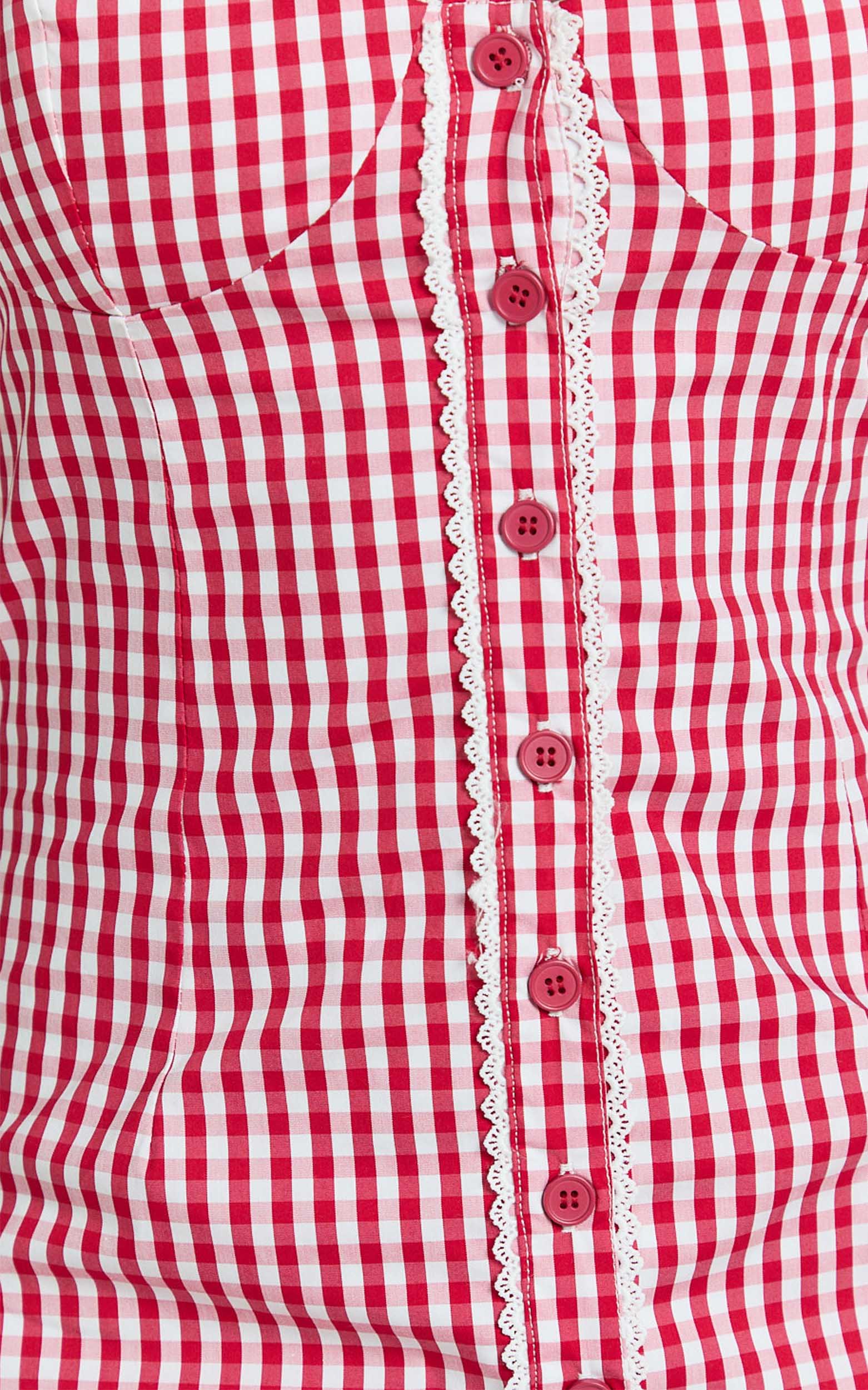 Anessa Midi Dress - Button Front Bustier Fitted Dress in Red Gingham