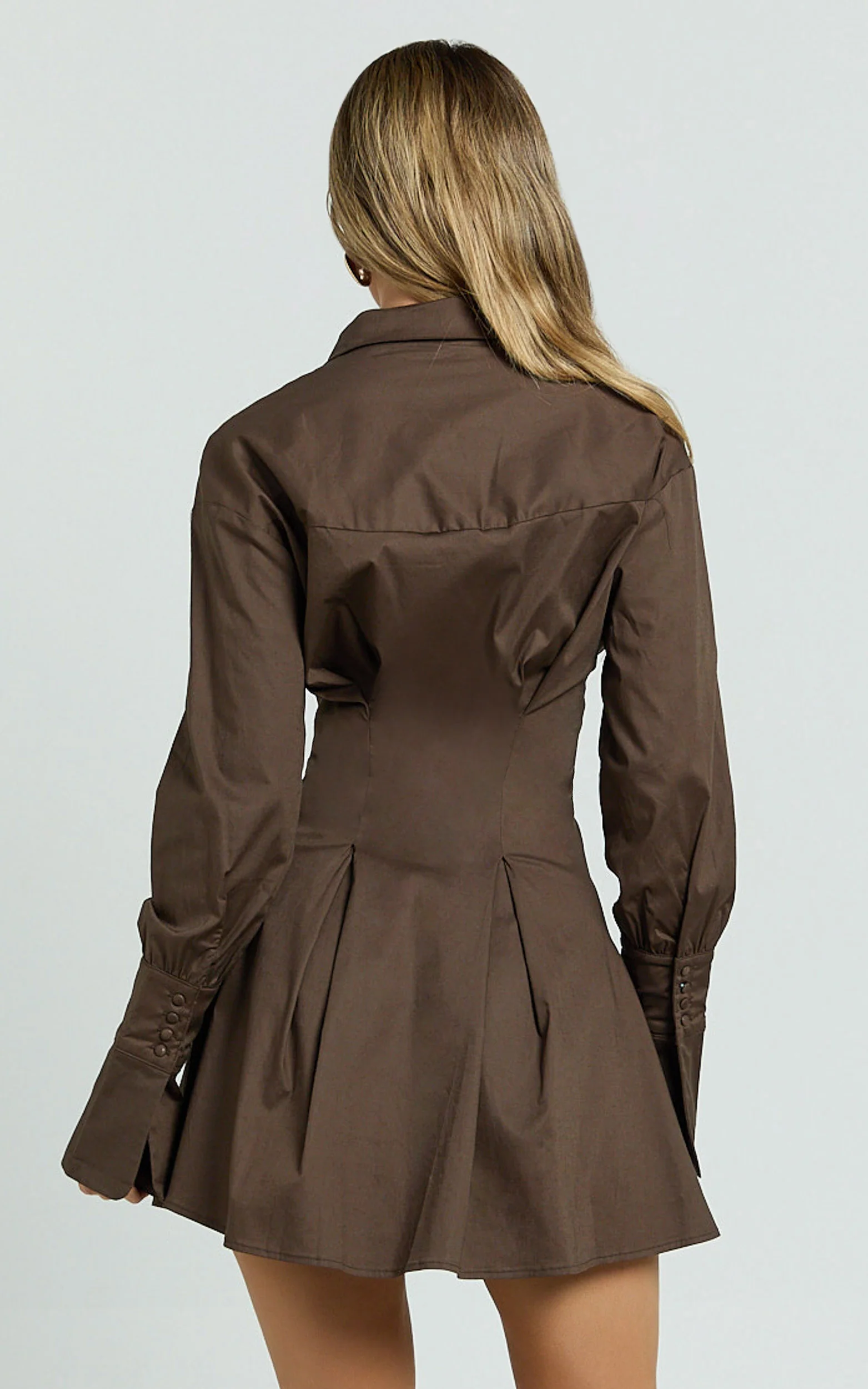 Yasmina Mini Dress - Button Front Long Sleeve Fit And Flare Dress in Dark Chocolate