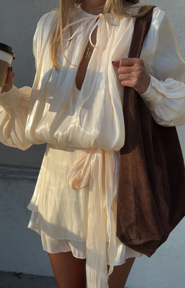 Quinton Pearl Satin Long Sleeve Tie Mini Dress