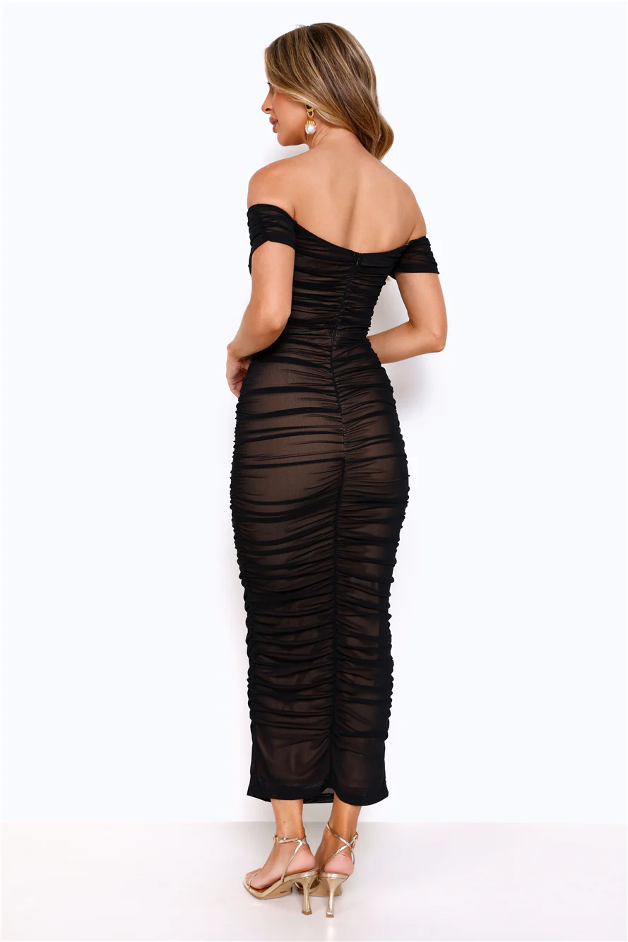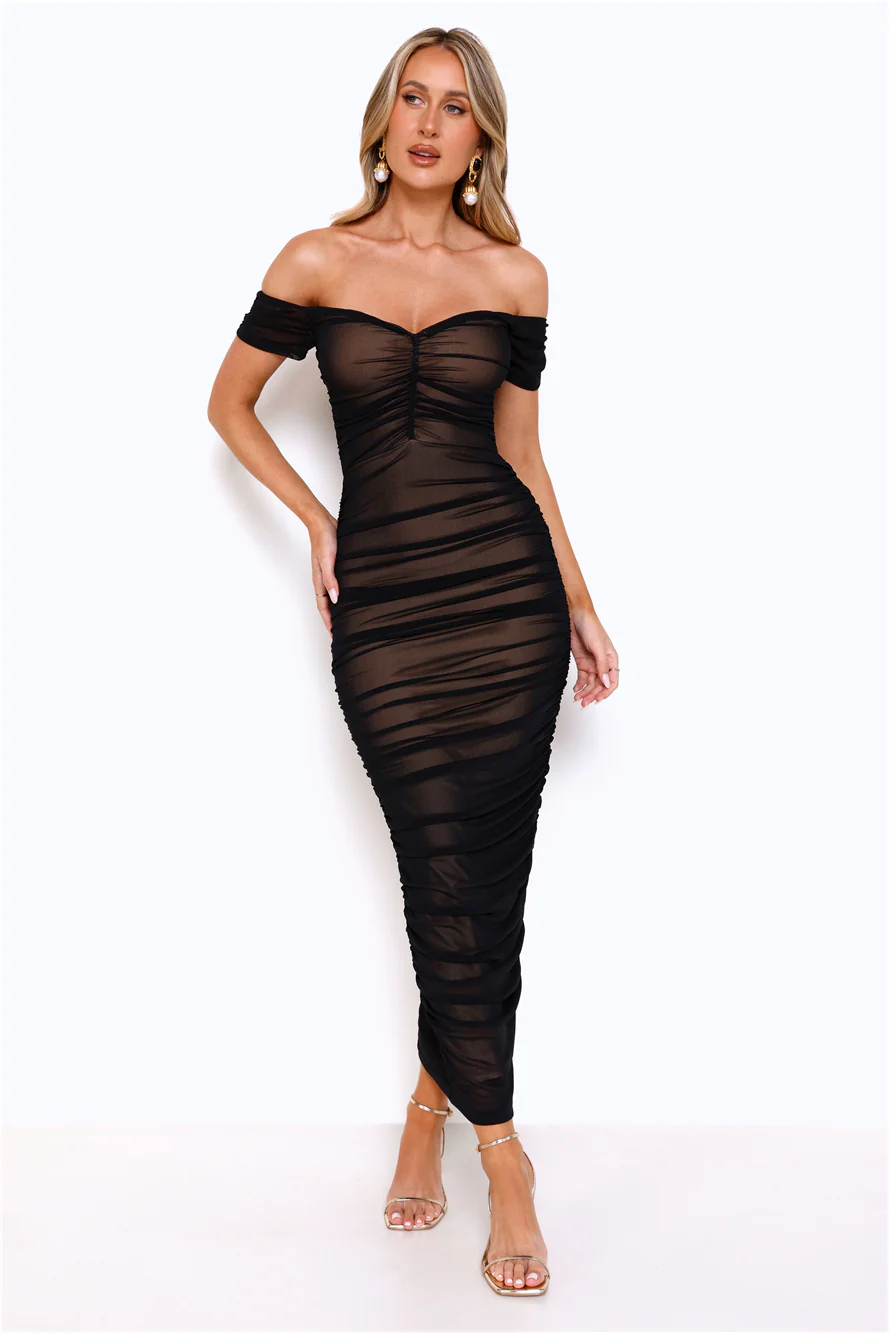 Power Moves Off Shoulder Mesh Maxi Dress Black