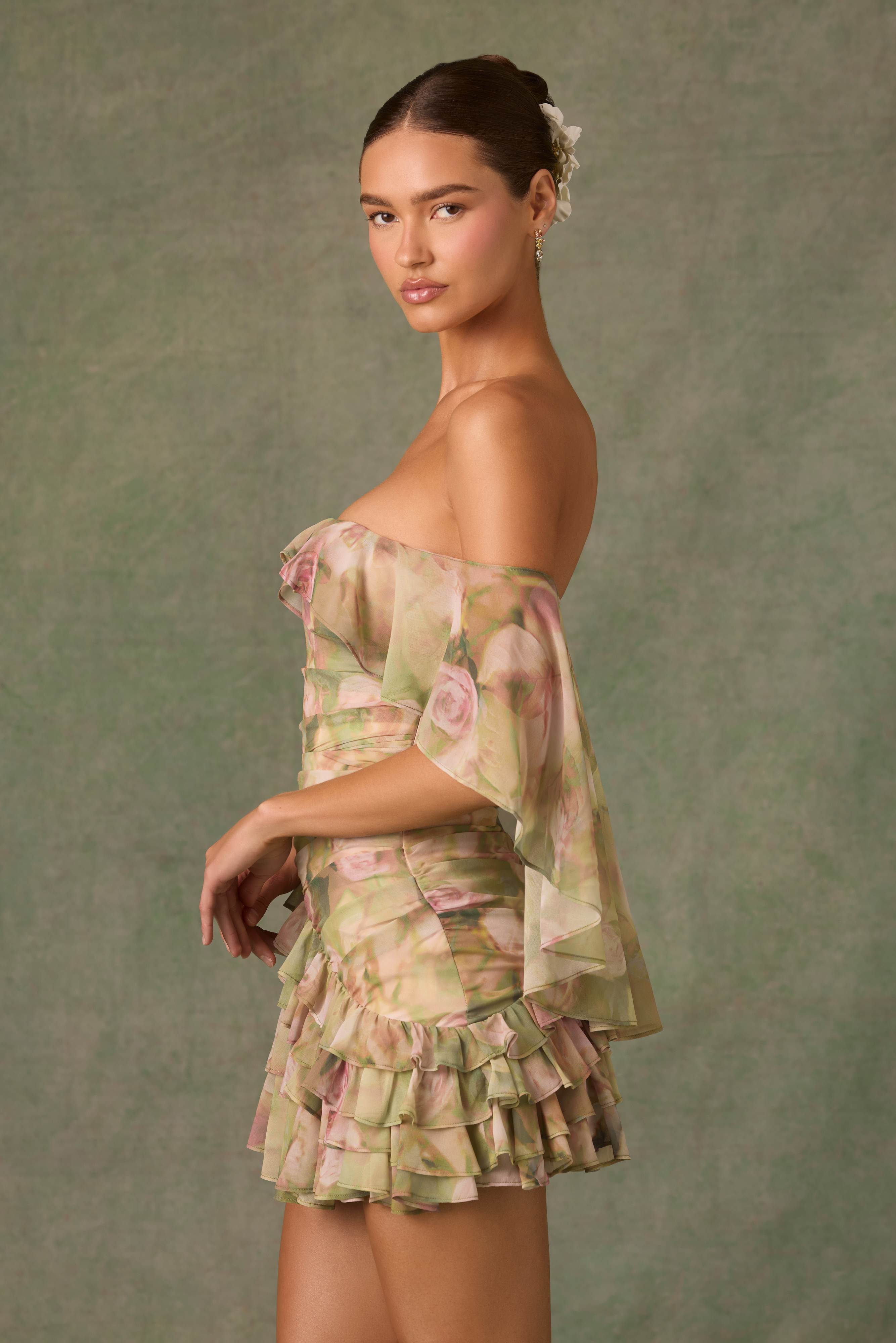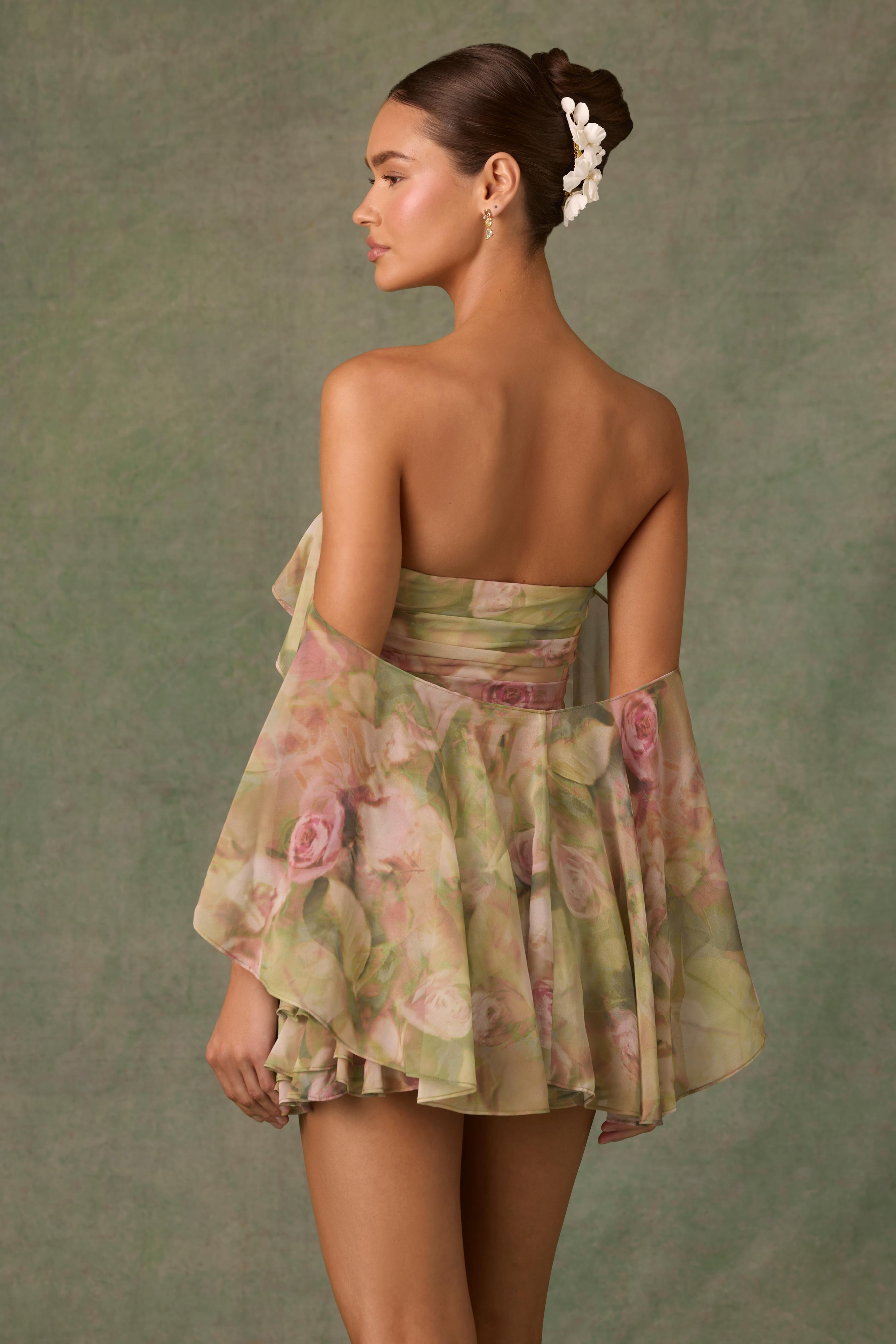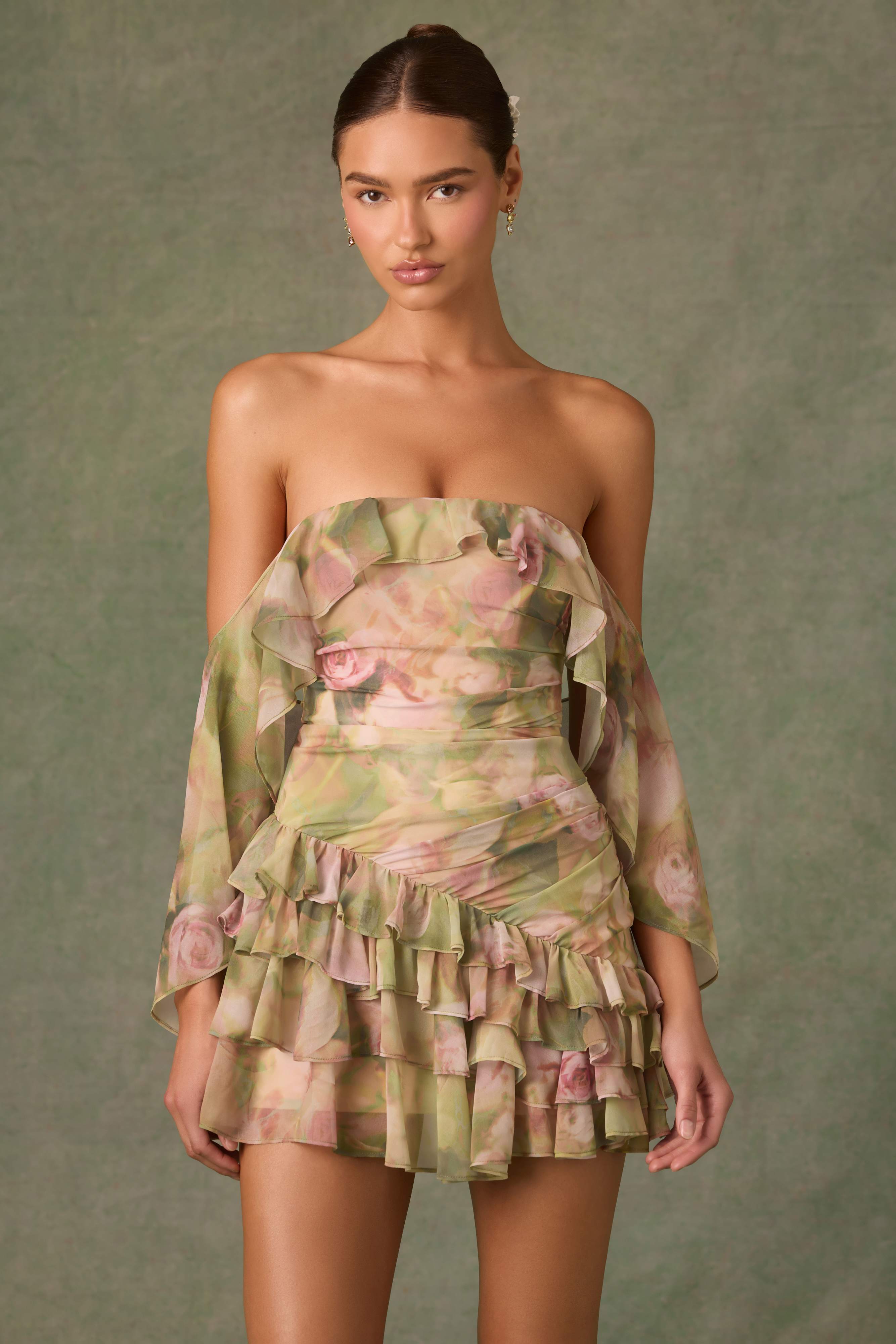 Birdie-Off-Shoulder Ruffled Mini Dress in Floral Multi Print