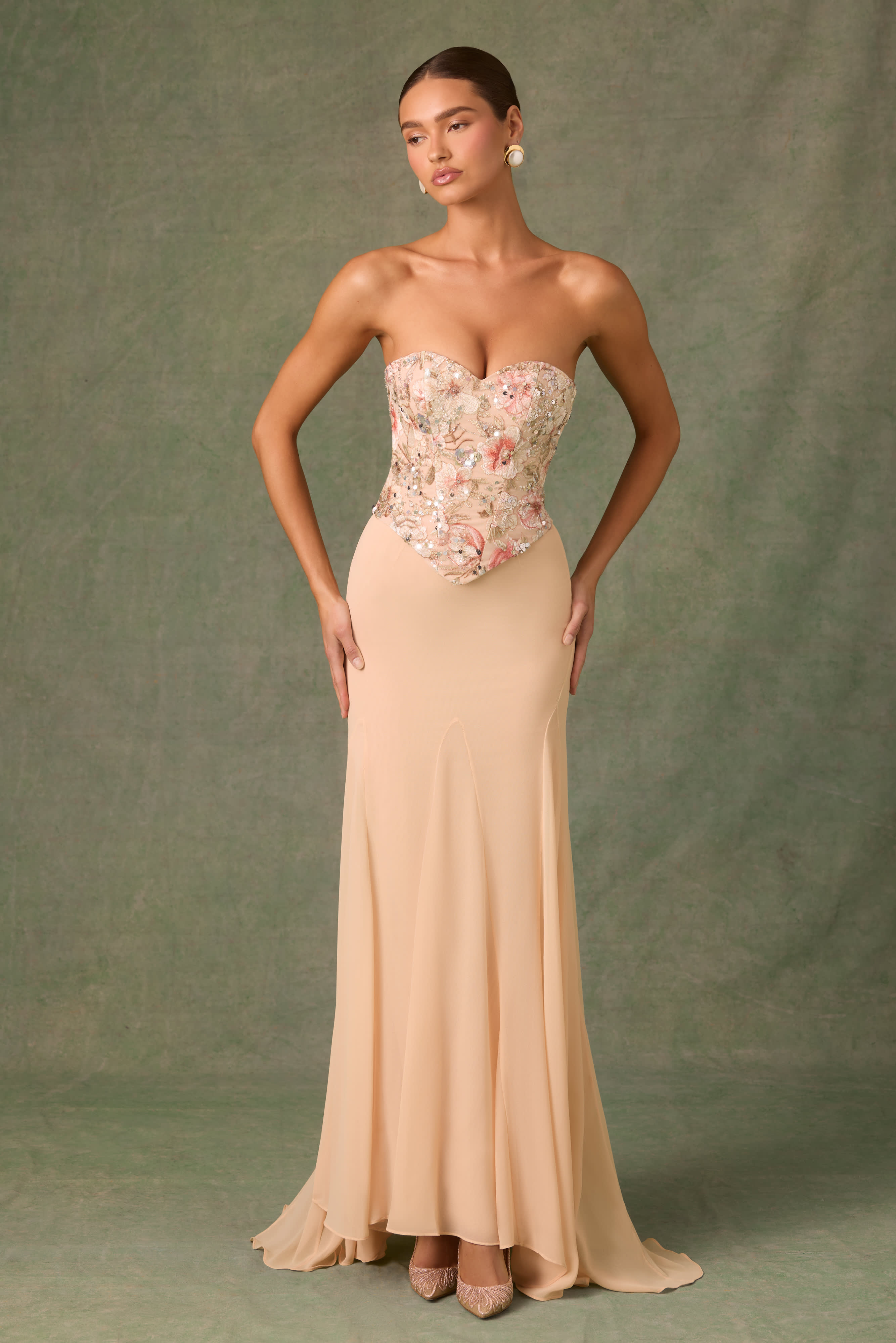 Lysana-Embellished Corset Fishtail Gown in Floral Beige